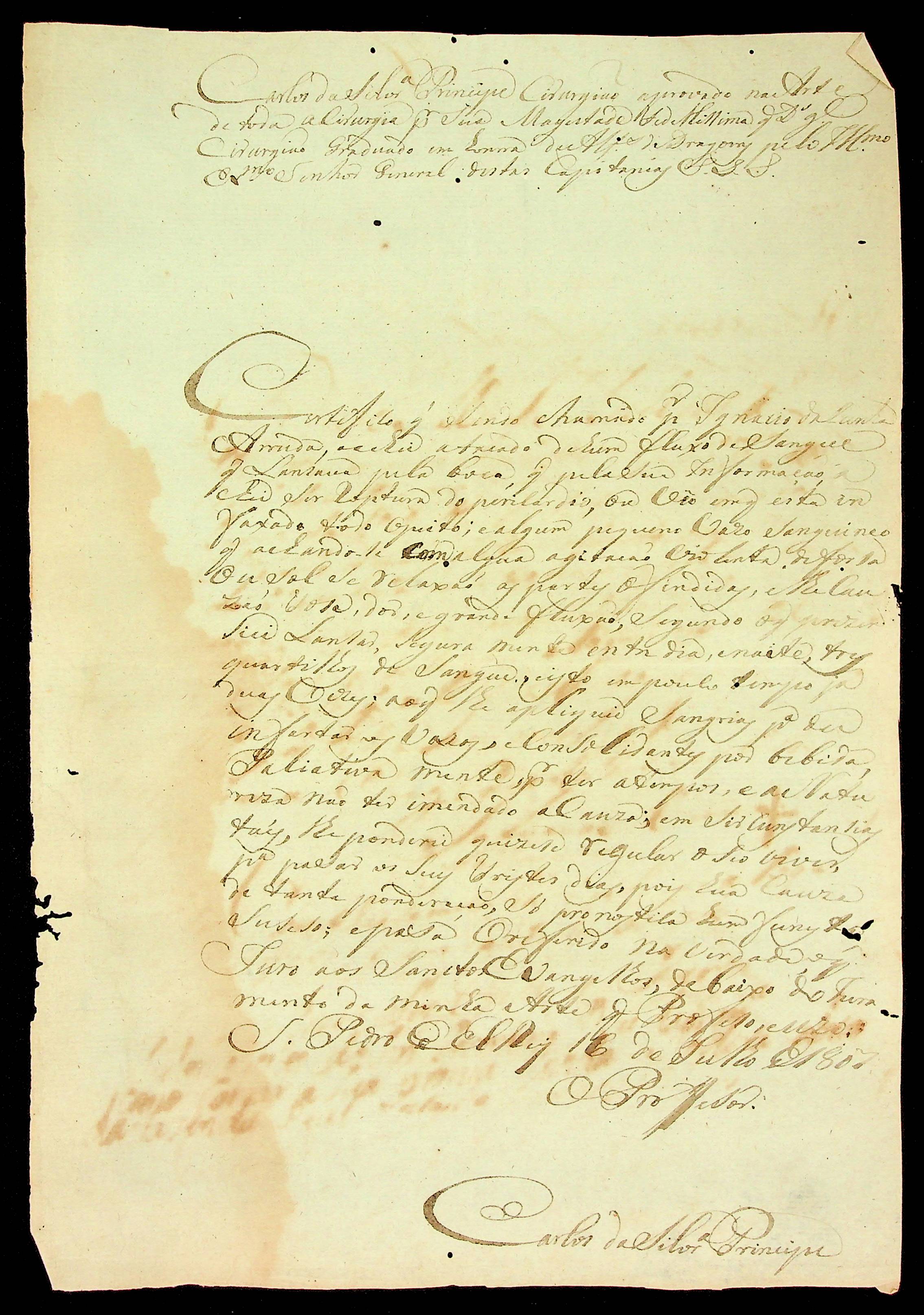 CERTIDÃO expedida pelo Cirurgião Carlos da Silva Príncipe sobre a enfermidade de Ignácio da Cunha Arruda.