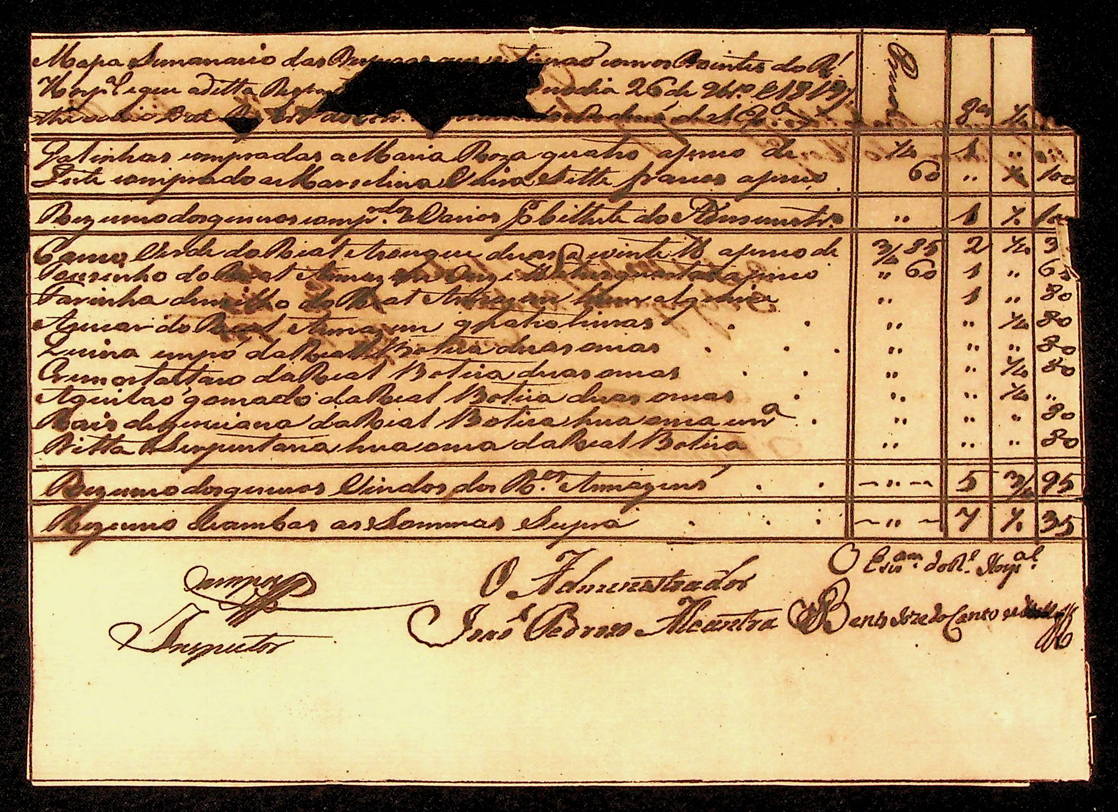 MAPA semanário das despesas com doentes do Real Hospital assinado pelo administrador João Pedroso de Alcântara e o escrivão Bento José Canto e Mello.