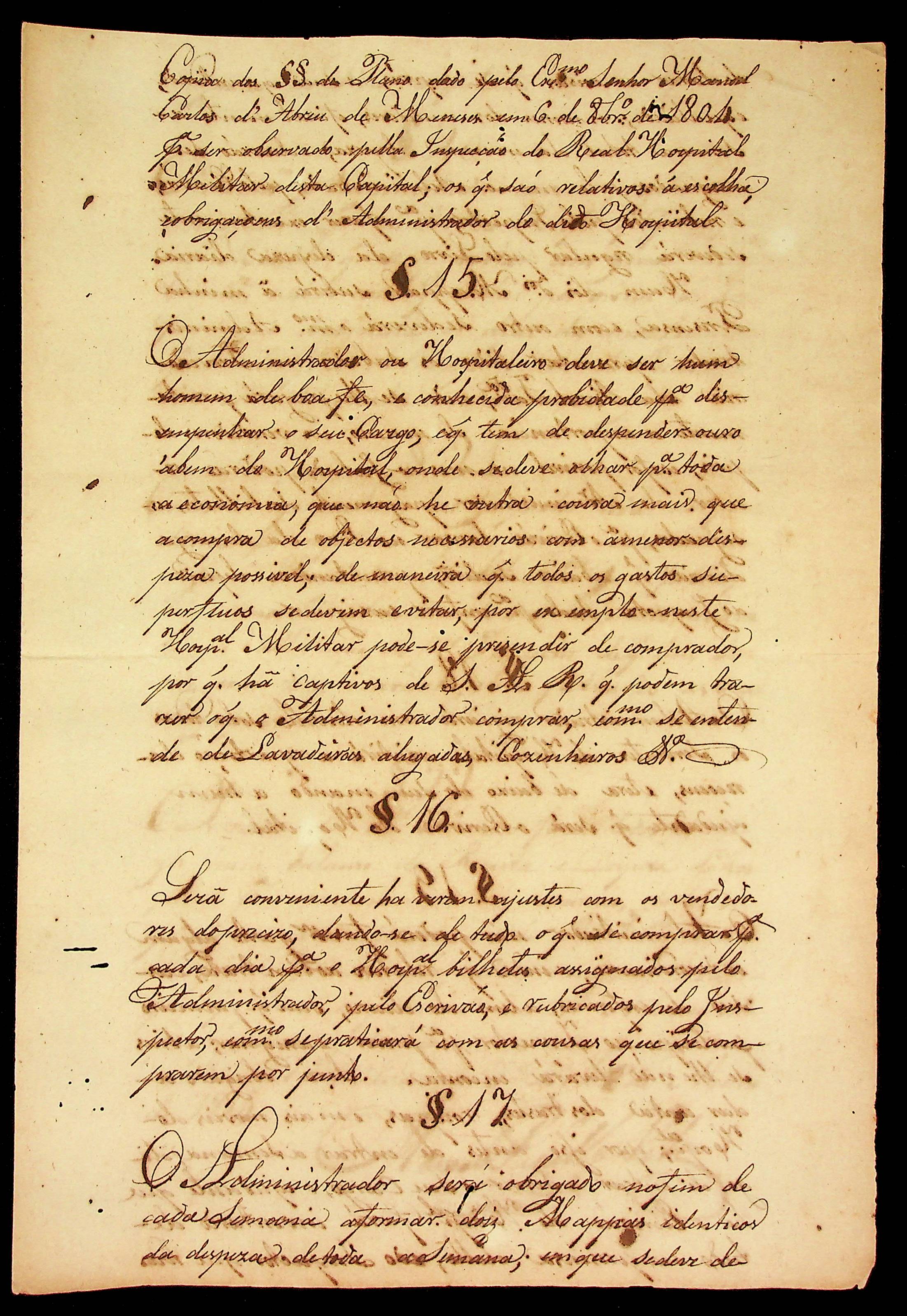 REGULAMENTO (cópia) dos Parágrafos do Plano dado pelo Excelentíssimo Governador Manoel Carlos Abreu deMenezes, em 6 de Outubro de 1804, para ser observado pela Inspeção do Real Hospital Militar desta Capital, os que são relativos à escolha e obrigação de administrador feito pelo comandante Manoel [Rabelo] Leite.