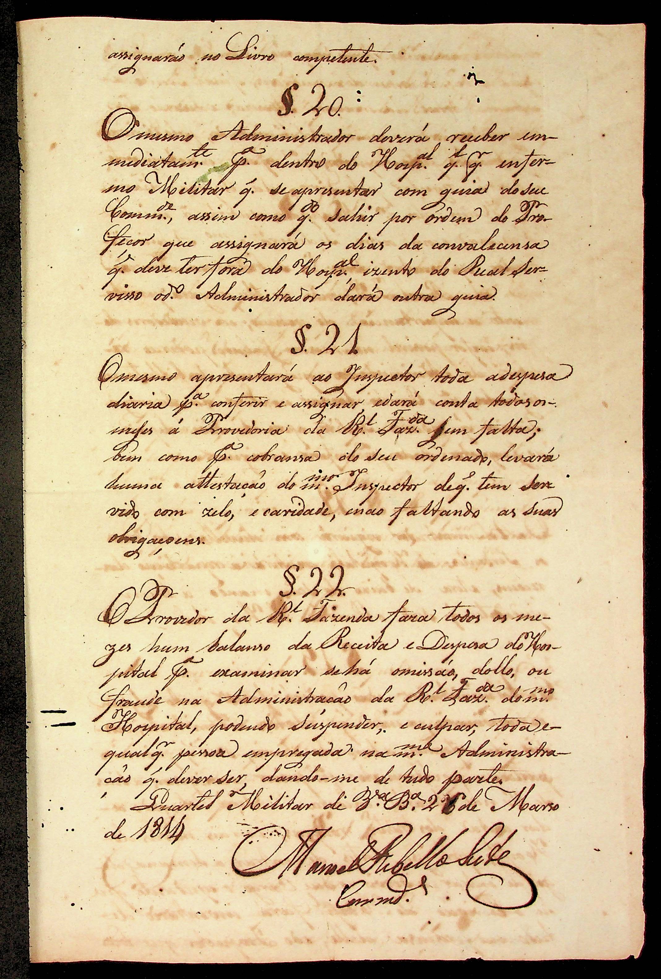 REGULAMENTO (cópia) dos Parágrafos do Plano dado pelo Excelentíssimo Governador Manoel Carlos Abreu deMenezes, em 6 de Outubro de 1804, para ser observado pela Inspeção do Real Hospital Militar desta Capital, os que são relativos à escolha e obrigação de administrador feito pelo comandante Manoel [Rabelo] Leite.