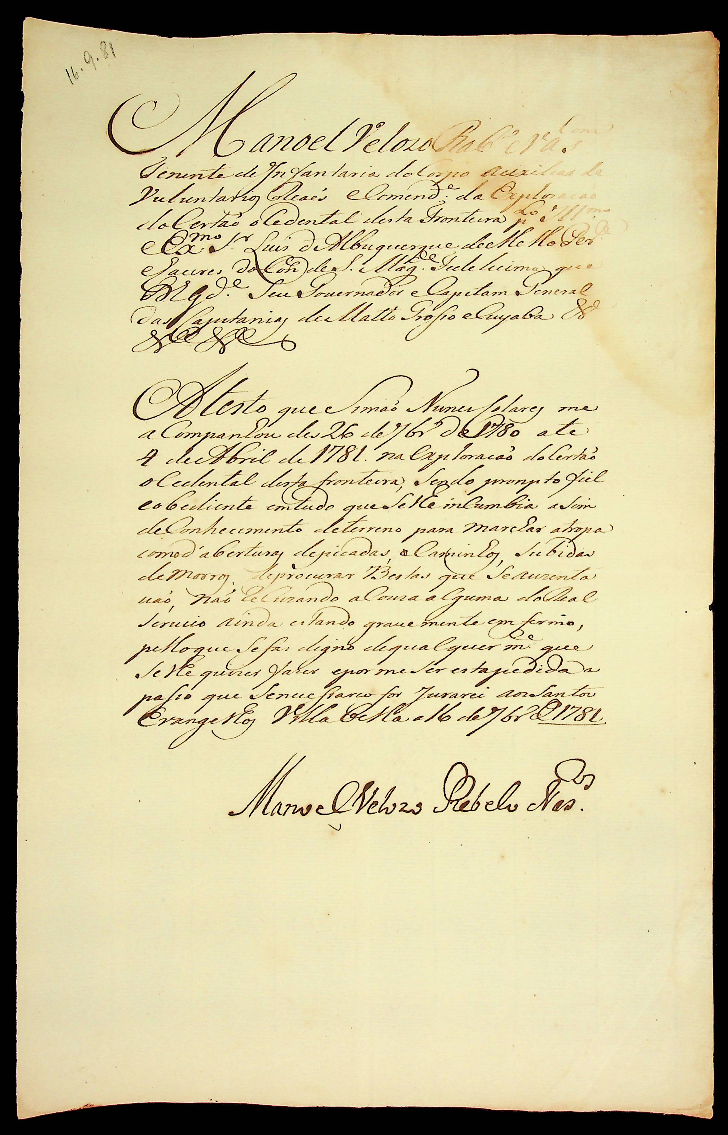 ATESTADO expedido pelo Tenente de Infantaria a favor de Simão Nunes Colares.