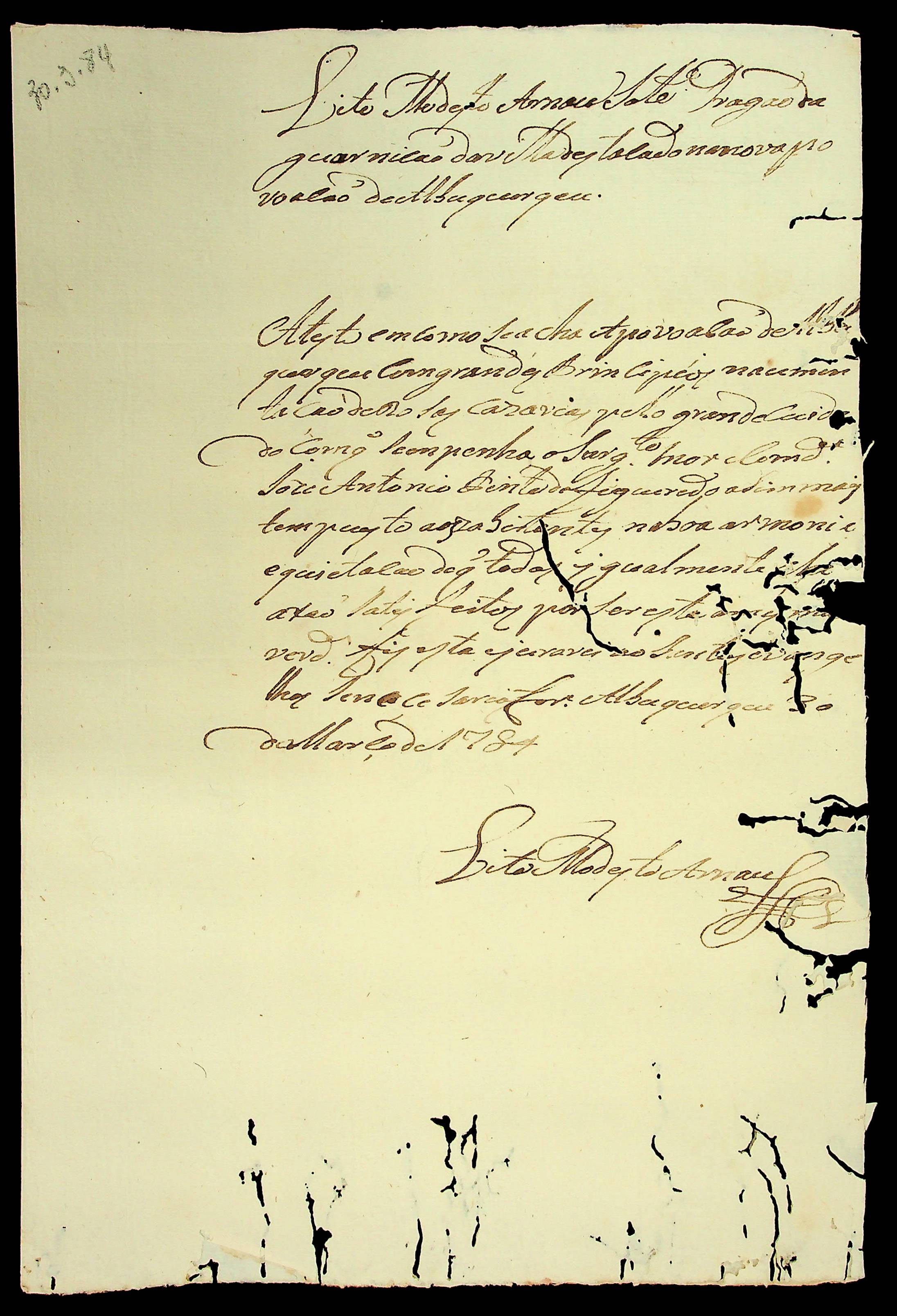 ATESTADO expedido pelo Dragão da Guarnição do Destacamento de Albuquerque [...] Modesto Arnou.