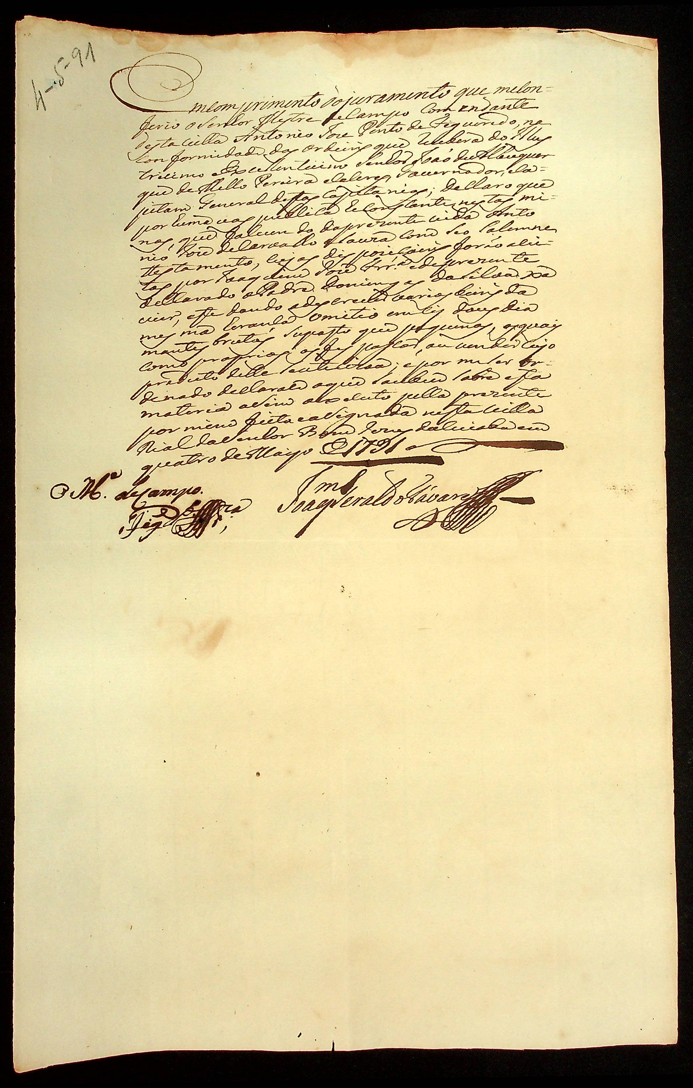 ATESTADO expedido por Francisco P […] Ferreira por ordem do Mestre de Campo e Comandante Antônio José Pinto de Figueiredo.
