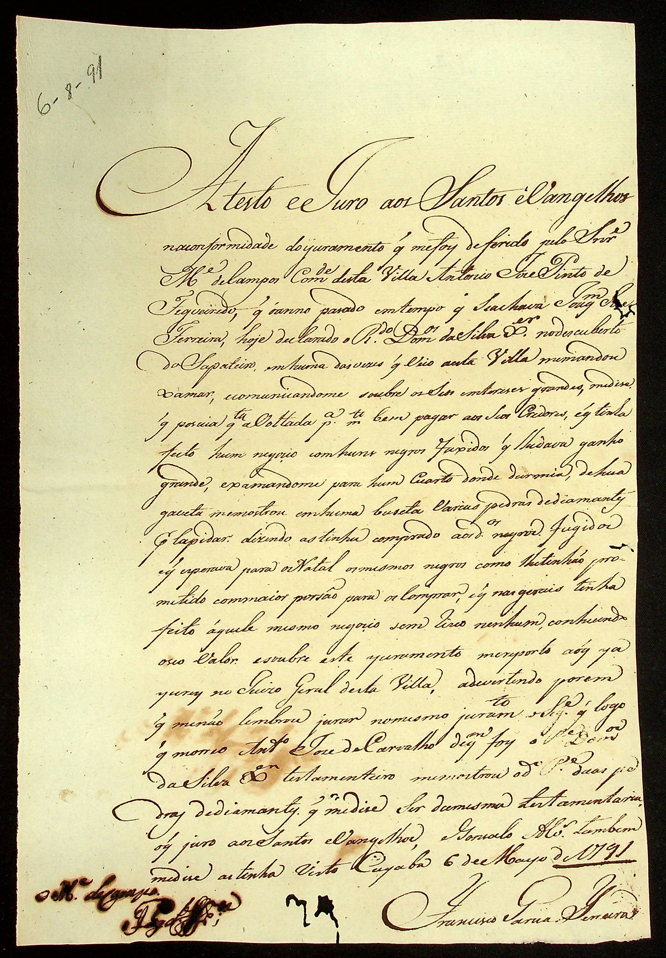 ATESTADO expedido por Bento Toledo Piza por ordem do Mestre de Campo e Comandante Antônio José Pinto de Figueiredo.