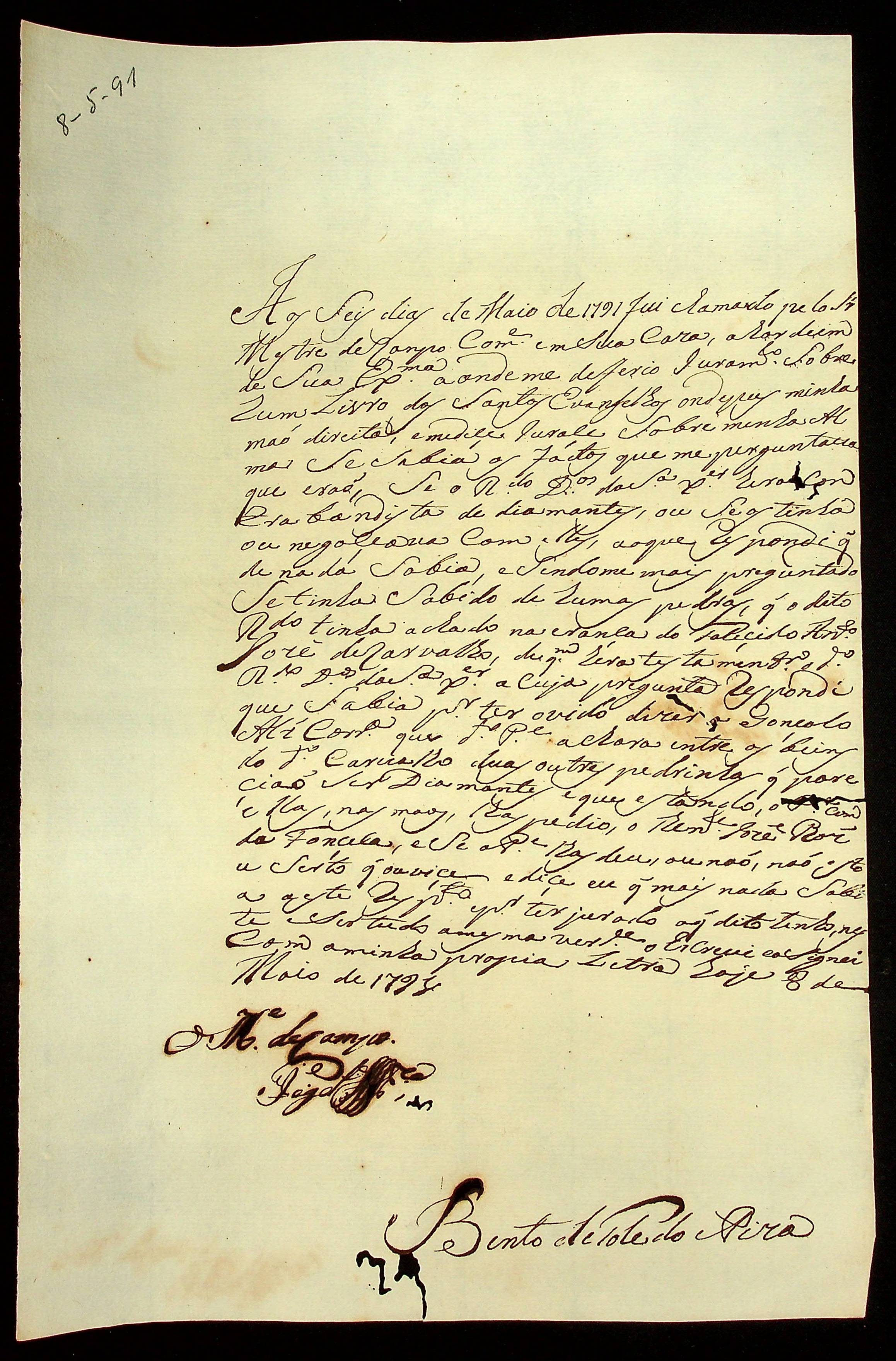 ATESTADO expedido por Floriano de Souza Neves por ordem do Mestre de Campo e Comandante Antônio José Pinto de Figueiredo.