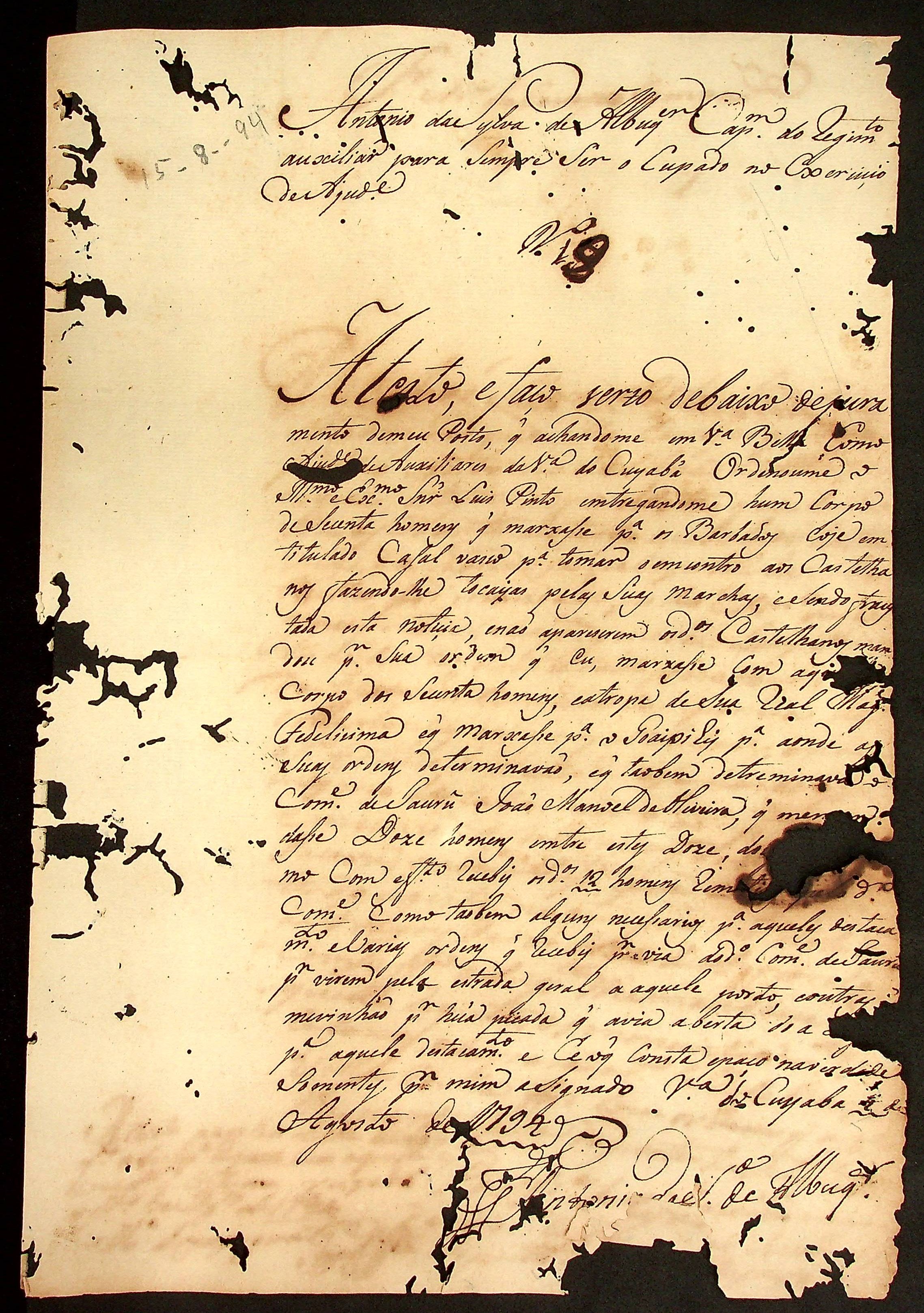 ATESTADO expedido pelo Capitão do Regimento Auxiliar Antônio da Silva de Albuquerque.