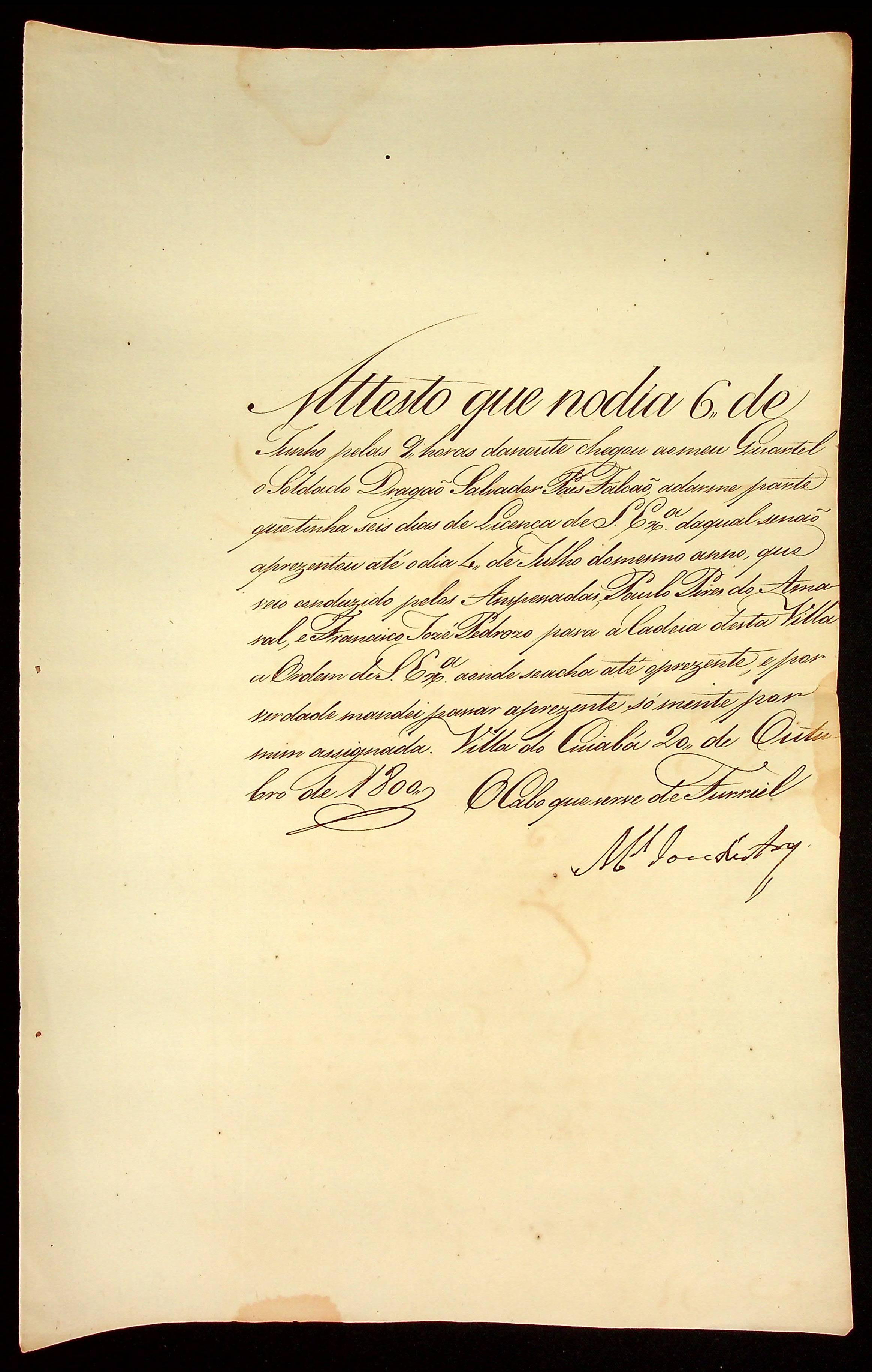 ATESTADO expedido pelo Cabo que serve de Furriel Manoel José de Araújo sobre o Soldado Dragão Salvador Paes Falcão.