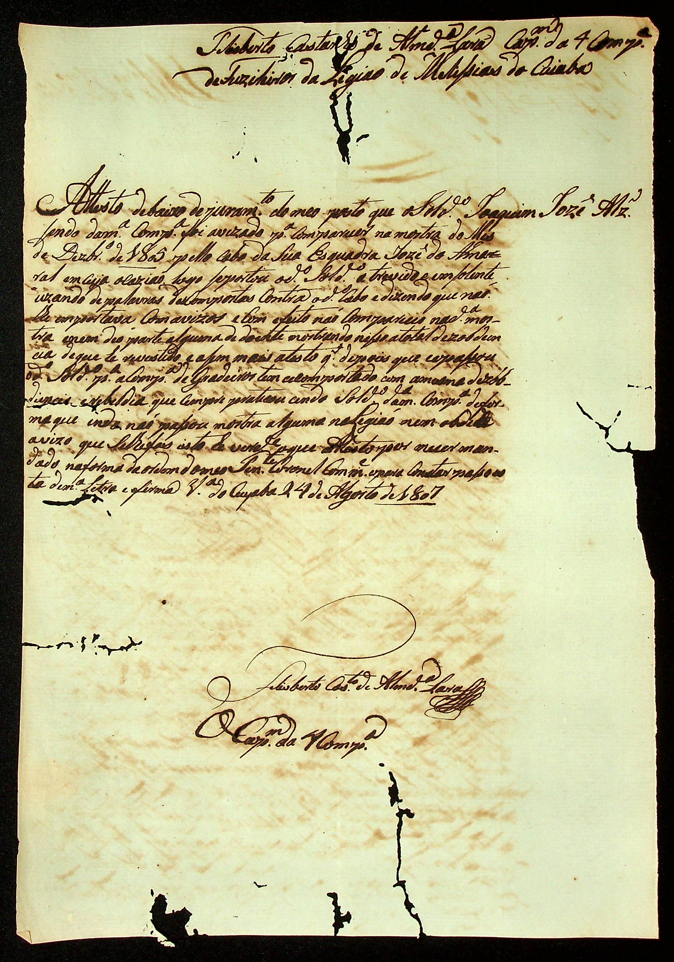 ATESTADO expedido pelo Capitão da 4ª Companhia de Fuzileiros da Legião de Milícias do Cuiabá Felisberto Castanho de Almeida Lara sobre o Soldado Joaquim José Alvarez.