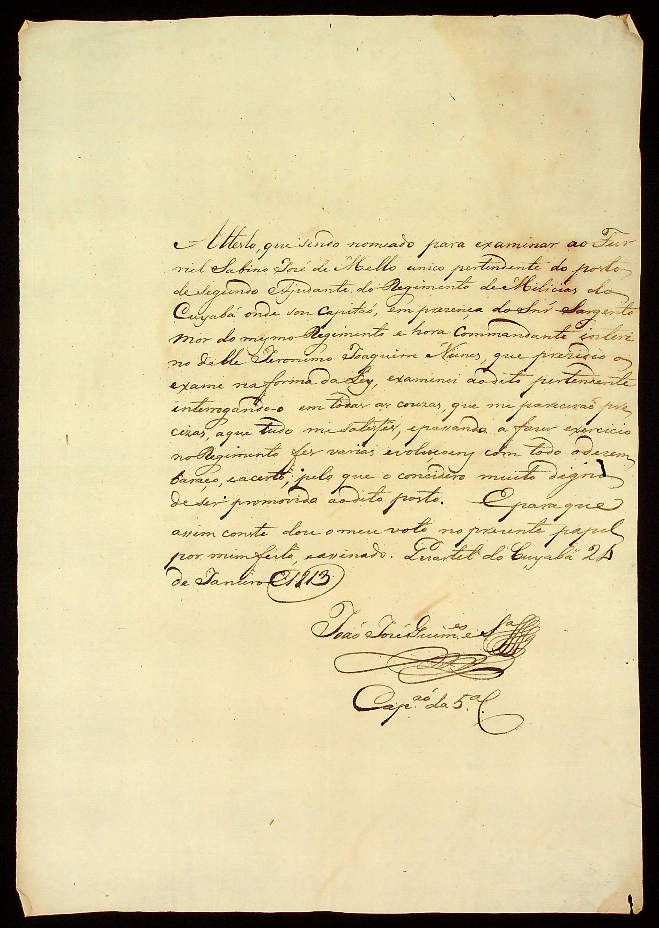 ATESTADO (conjunto) sobre o exame realizado pelo Furriel Sabiano José de Melo ao posto de 2º Ajudante de Milícias.