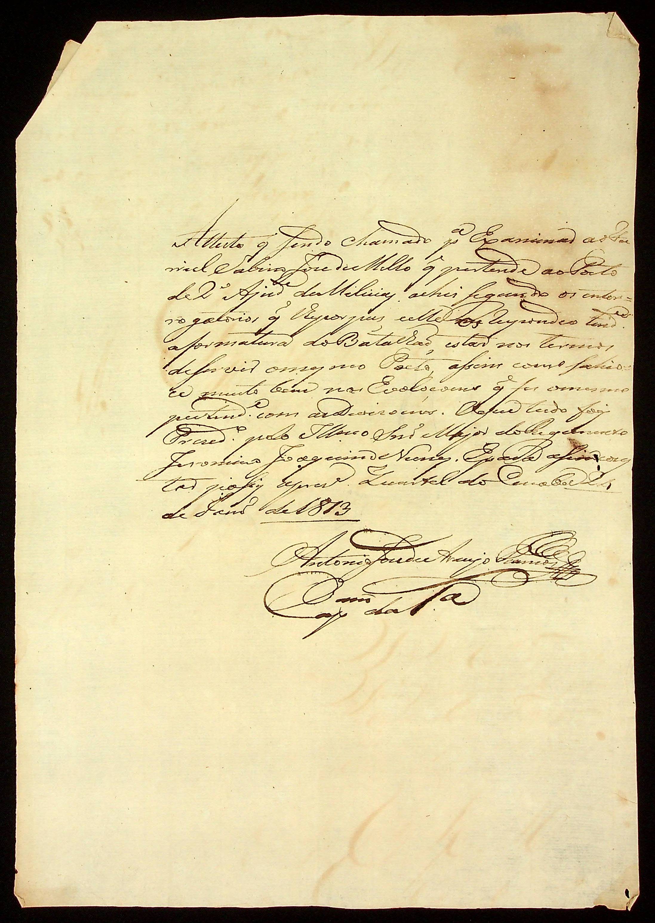 ATESTADO (conjunto) sobre o exame realizado pelo Furriel Sabiano José de Melo ao posto de 2º Ajudante de Milícias.