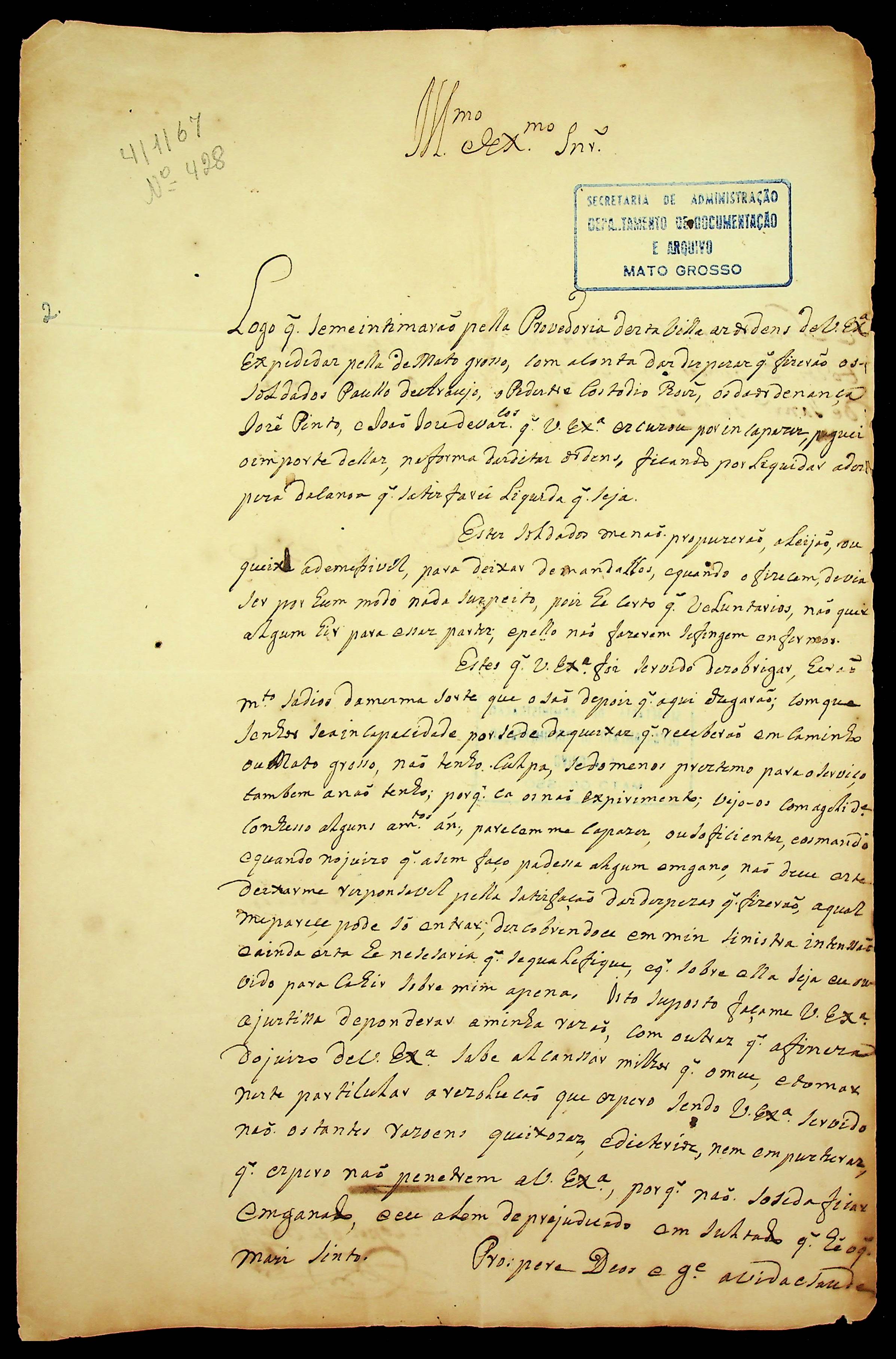 CARTA do [Mestre de Campo] Francisco Lopes de Araújo ao [Governador e Capitão-General da Capitania de Mato Grosso João Pedro da Câmara].