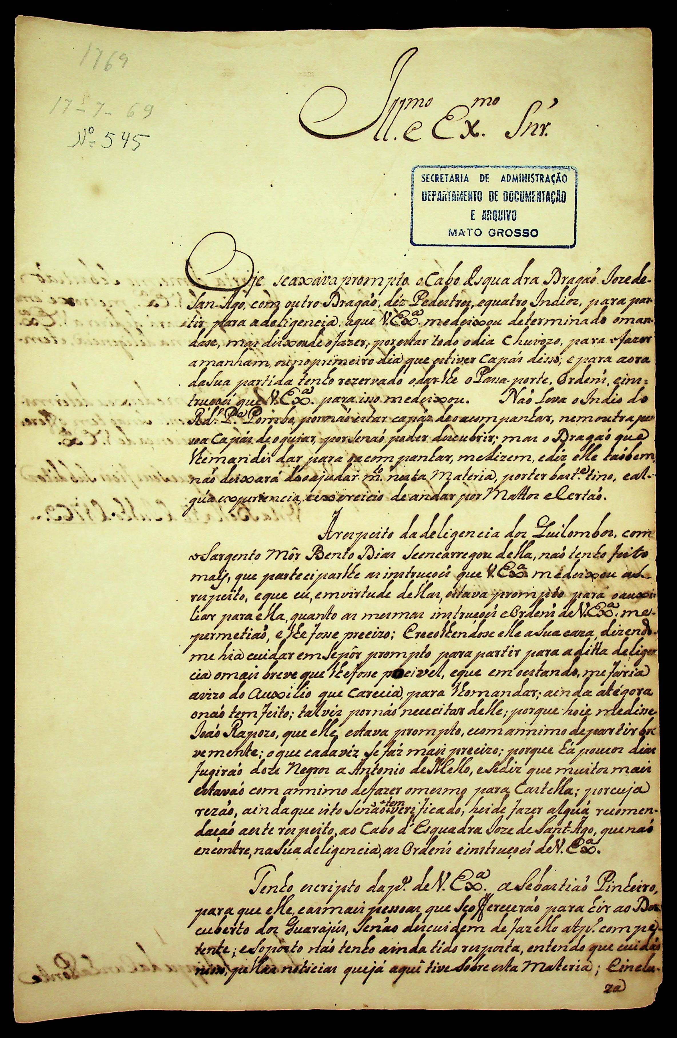 CARTA do [Capitão] Antônio Felipe da Cunha Ponte ao Governador e Capitão-General da Capitania de Mato Grosso Luiz Pinto de Souza Coutinho.