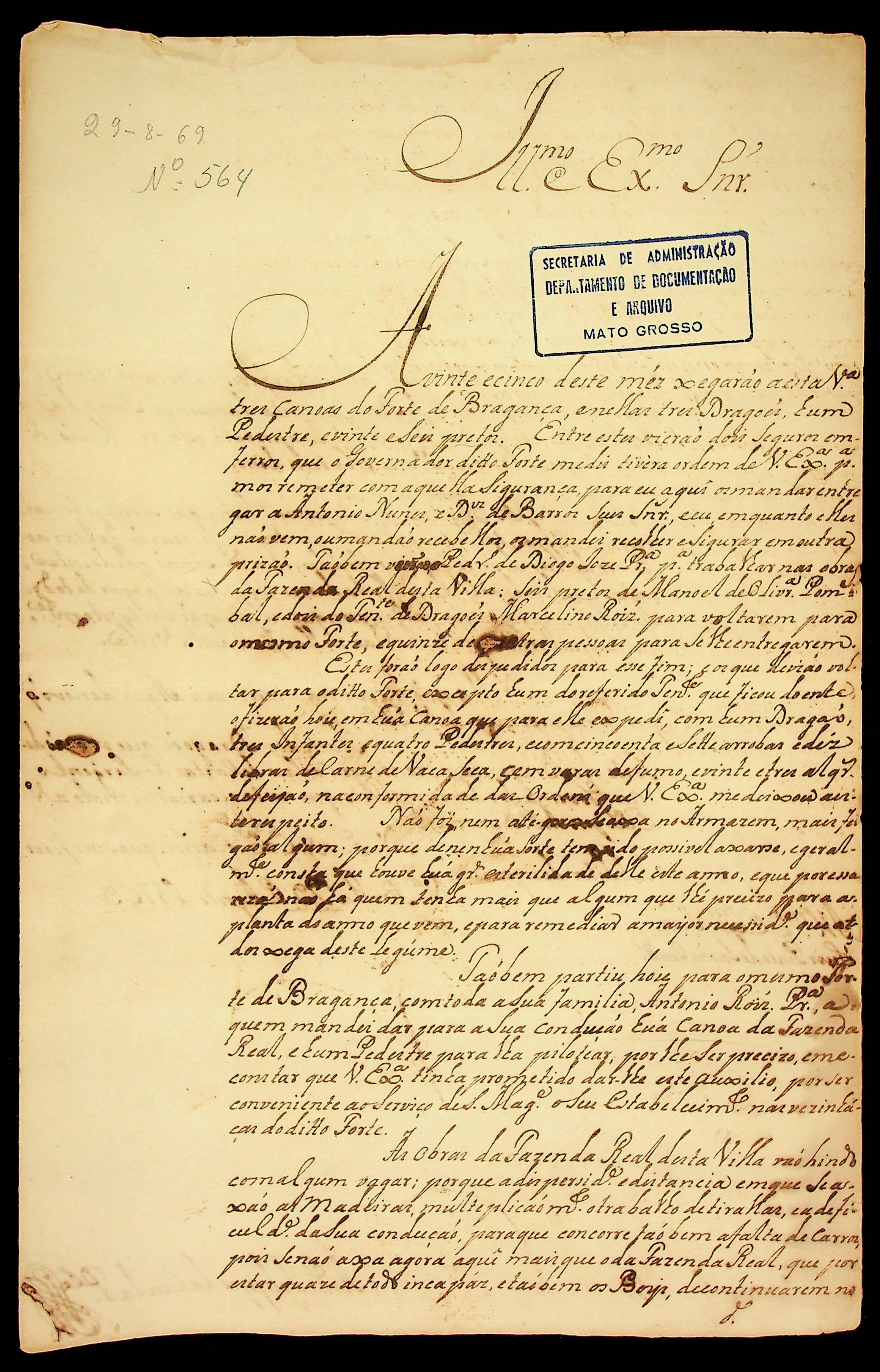 CARTA do [Ajudante de Ordens] Antônio Felipe da Cunha ao [Governador e Capitão-General da Capitania de Mato Grosso] Luís Pinto de Souza Coutinho.