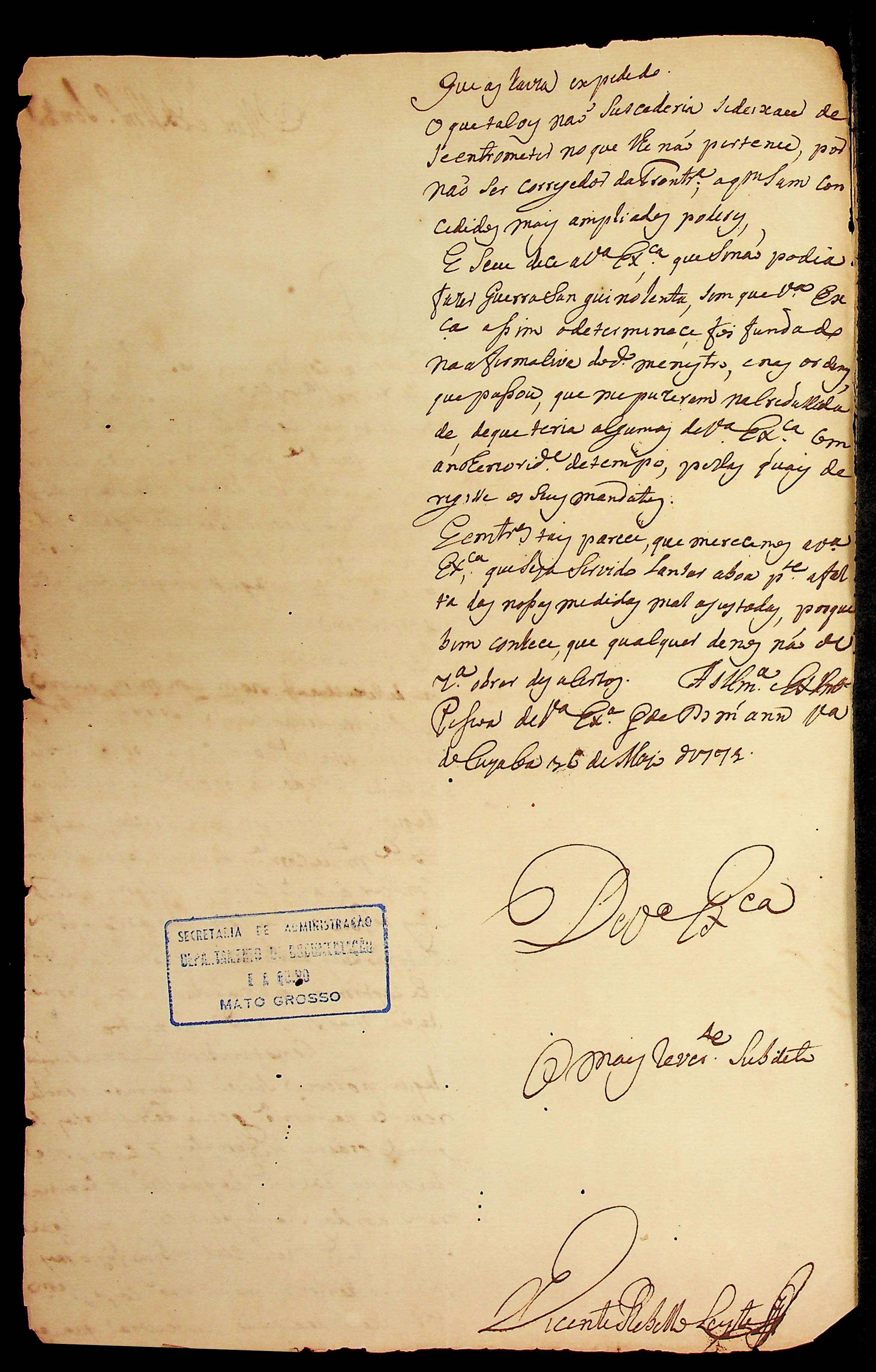 CARTA do [Capitão] Vicente Rebelo Leite ao [Governador e Capitão-General da Capitania de Mato Grosso Luiz Pinto de Souza Coutinho].