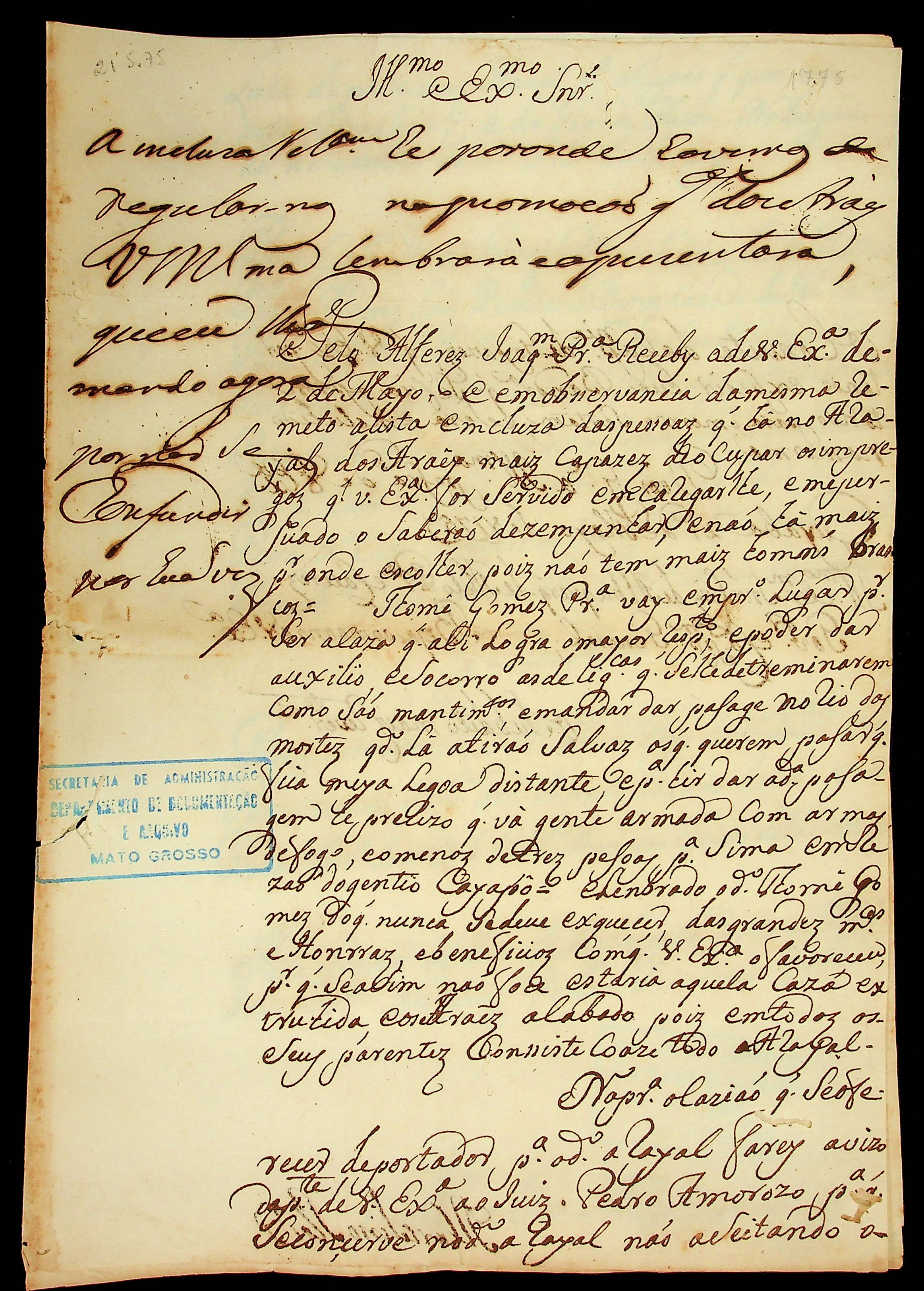 CARTA de Marcelino Rodrigues Camponês ao [Governador e Capitão-General da Capitania de Mato Grosso] Luiz de Albuquerque de Mello Pereira e Cáceres.