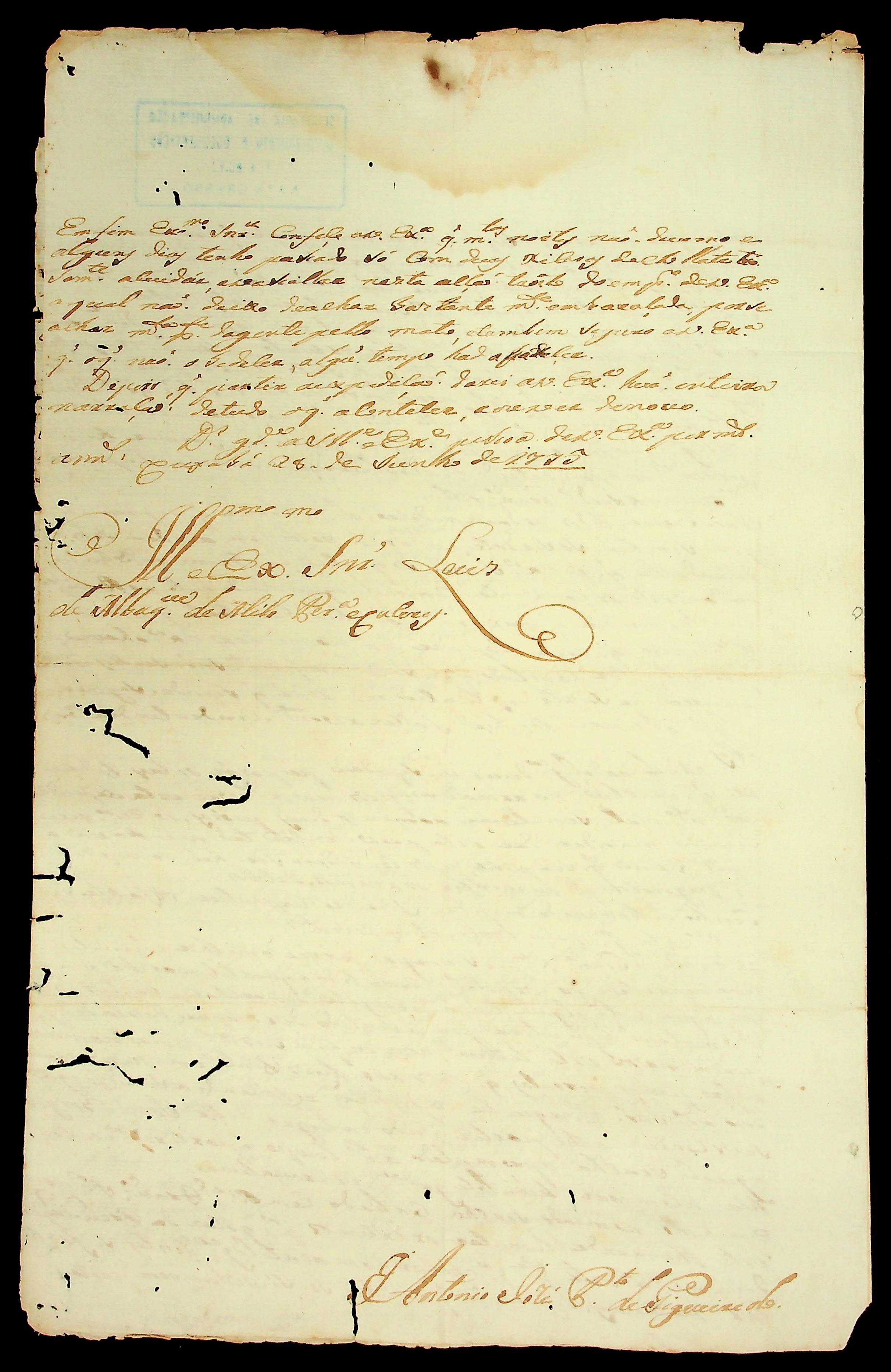 CARTA do [Mestre de Campo] Antônio José Pinto de Figueiredo ao [Governador e Capitão-General da Capitania de Mato Grosso] Luiz de Albuquerque de Mello Pereira e Cáceres.
