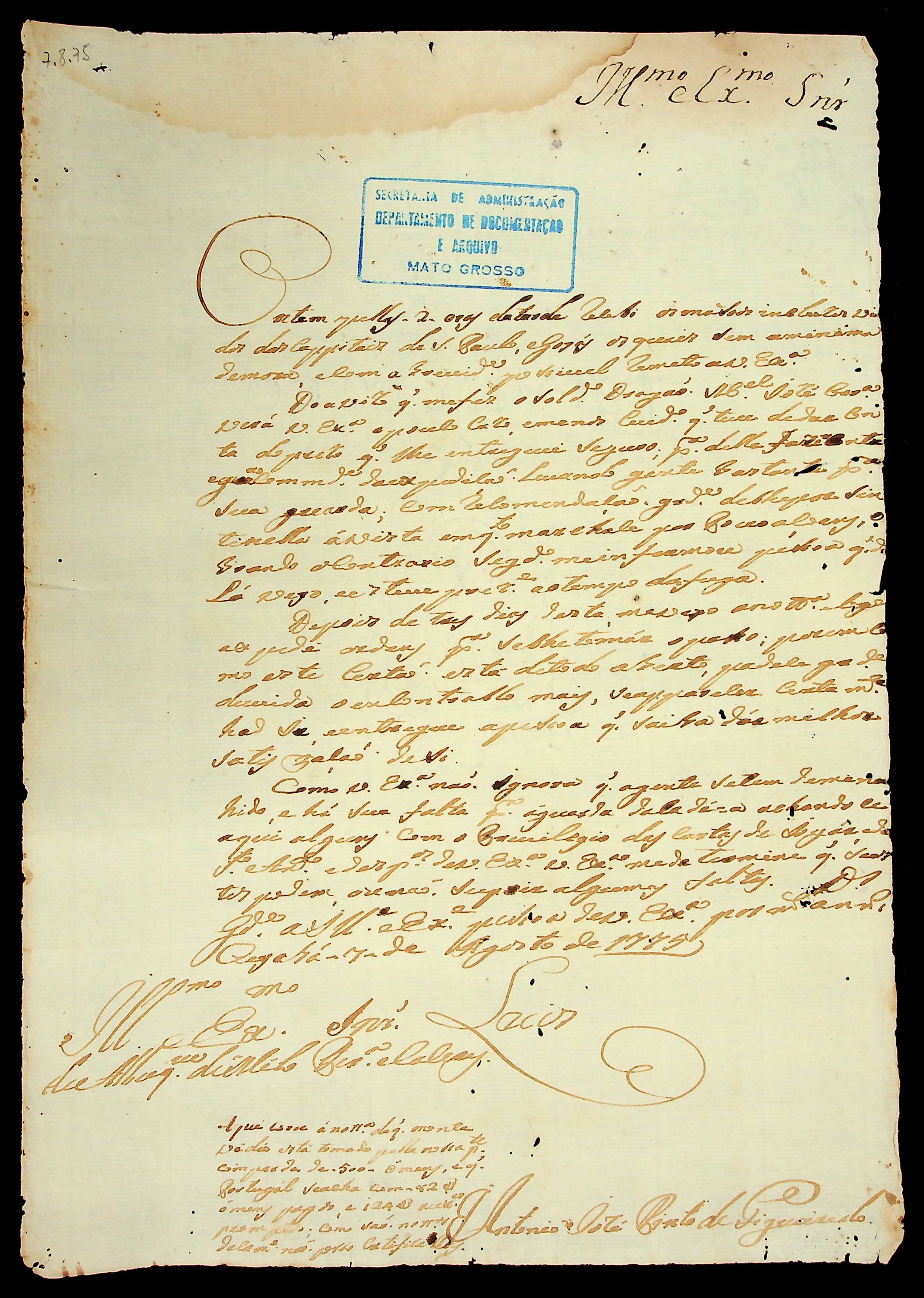 CARTA do [Mestre de Campo e Comandante] Antônio José Pinto de Figueiredo ao [Governador e Capitão-General da Capitania de Mato Grosso] Luiz de Albuquerque de Mello Pereira e Cáceres.