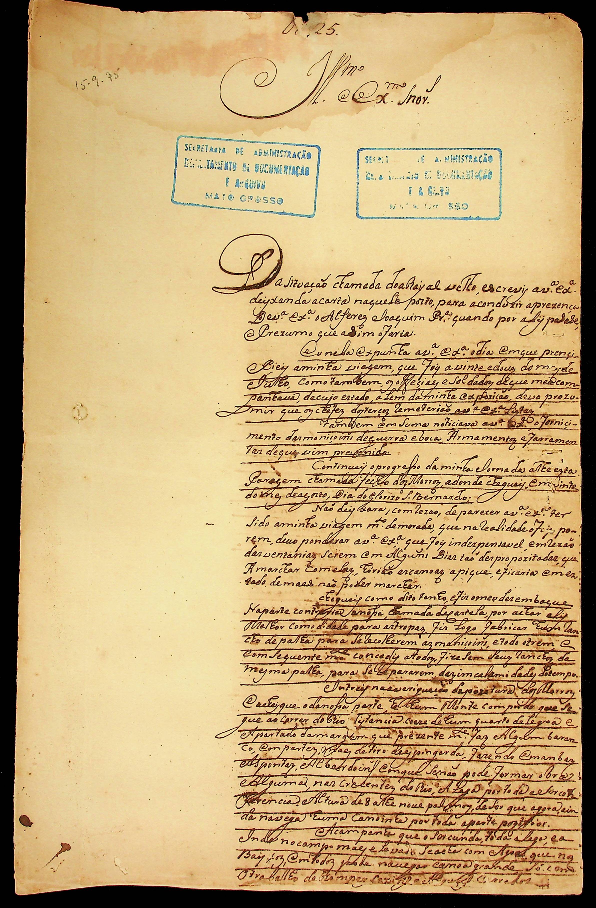 CARTA de [Capitão] Mathias Ribeiro da Costa ao Governador e Capitão-General da Capitania de Mato Grosso Luiz de Albuquerque de Mello Pereira e Cáceres.