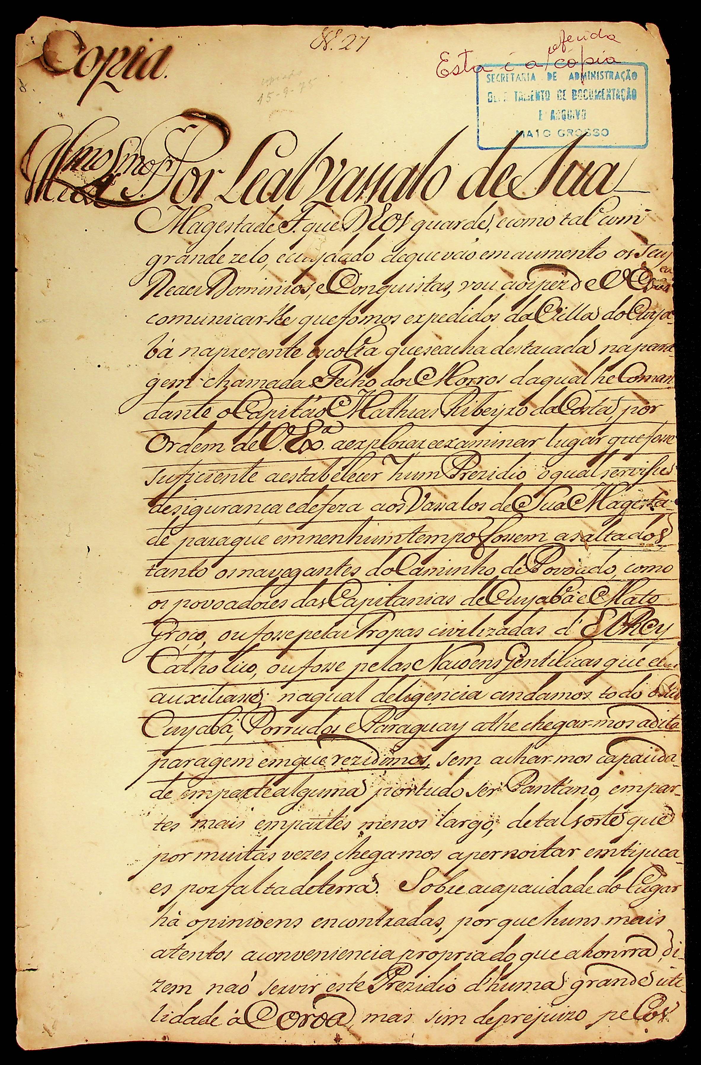 CARTA de João José de Vasconcelos ao Governador e Capitão-General da Capitania de Mato Grosso Luiz de Albuquerque de Mello Pereira e Cáceres.