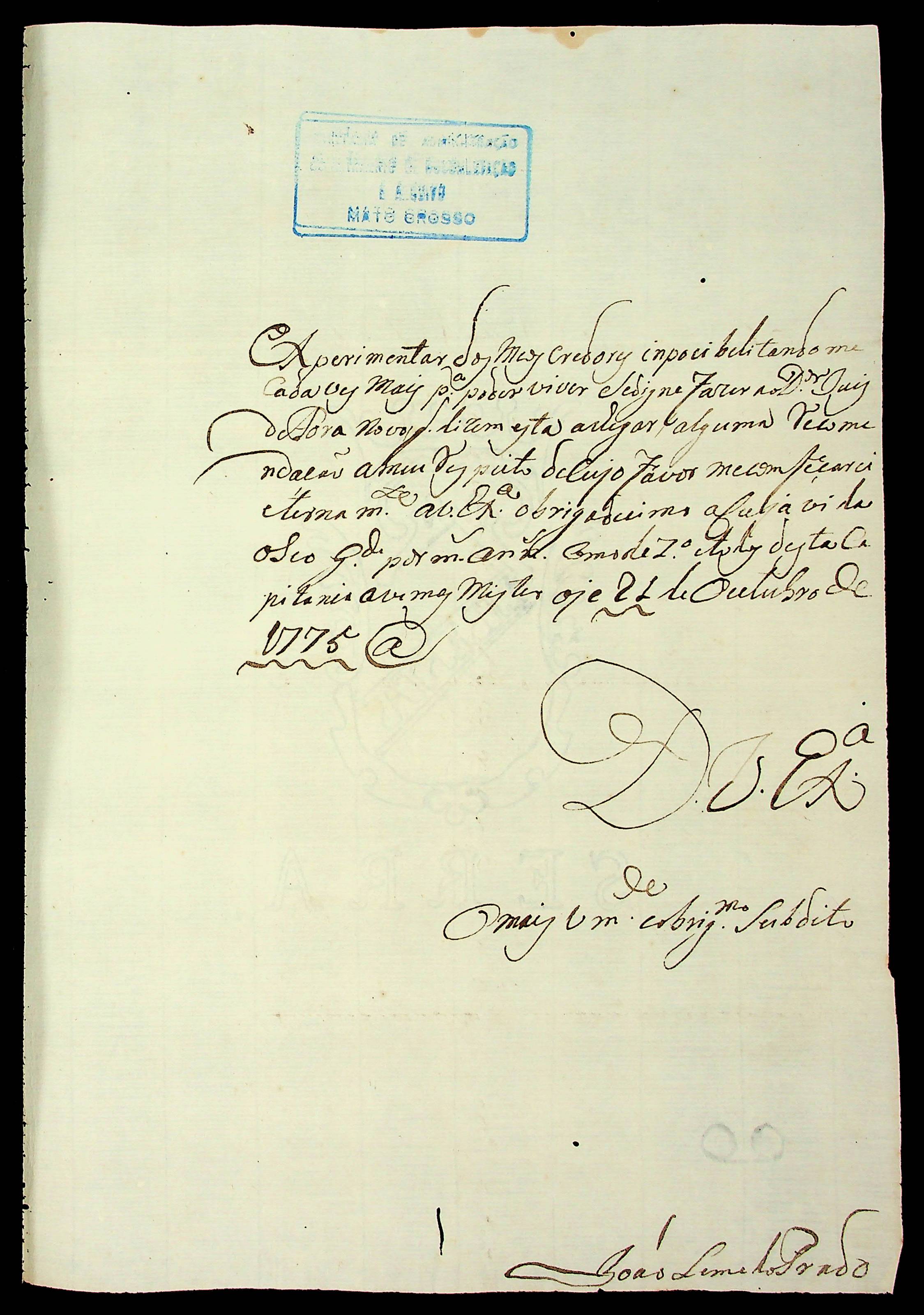 CARTA de João Leme do Prado ao Governador e Capitão-General da Capitania de Mato Grosso Luiz de Albuquerque de Mello Pereira e Cáceres.