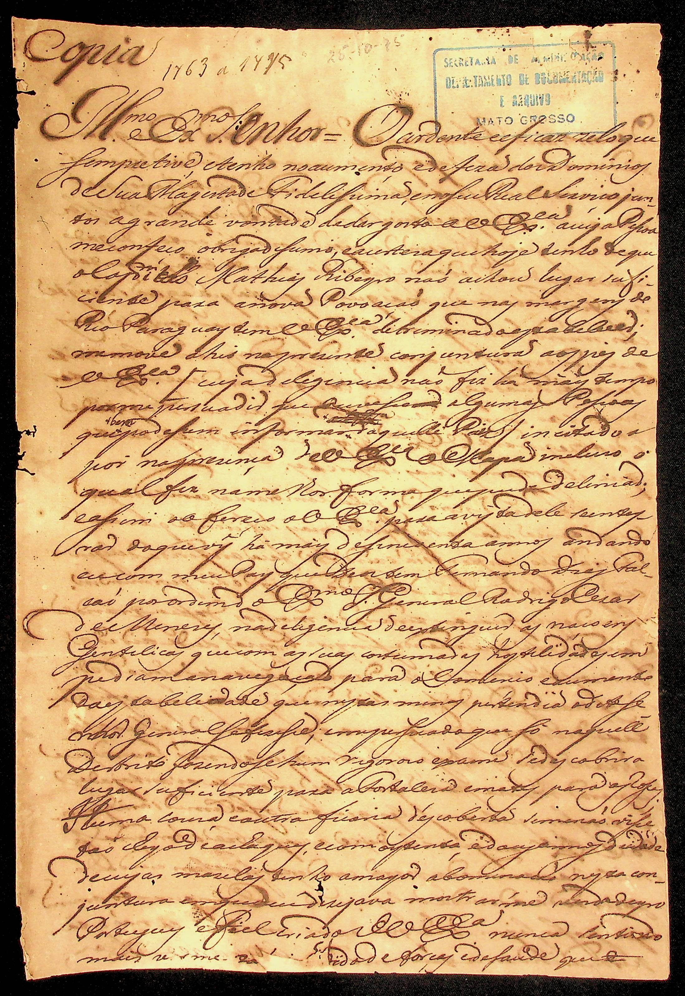CARTA de José Paes Falcão ao Governador e Capitão-General da Capitania de Mato Grosso Luiz de Albuquerque de Mello Pereira e Cáceres.