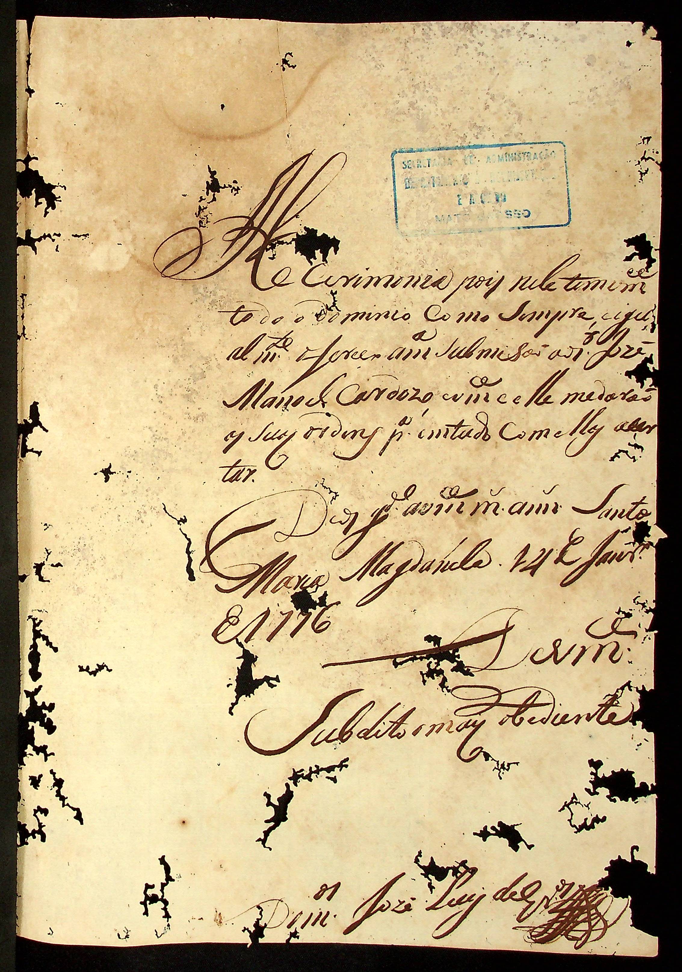 CARTA de Domingos José Luís de […] ao Governador e Capitão-General da Capitania de Mato Grosso Luiz de Albuquerque de Mello Pereira e Cáceres.