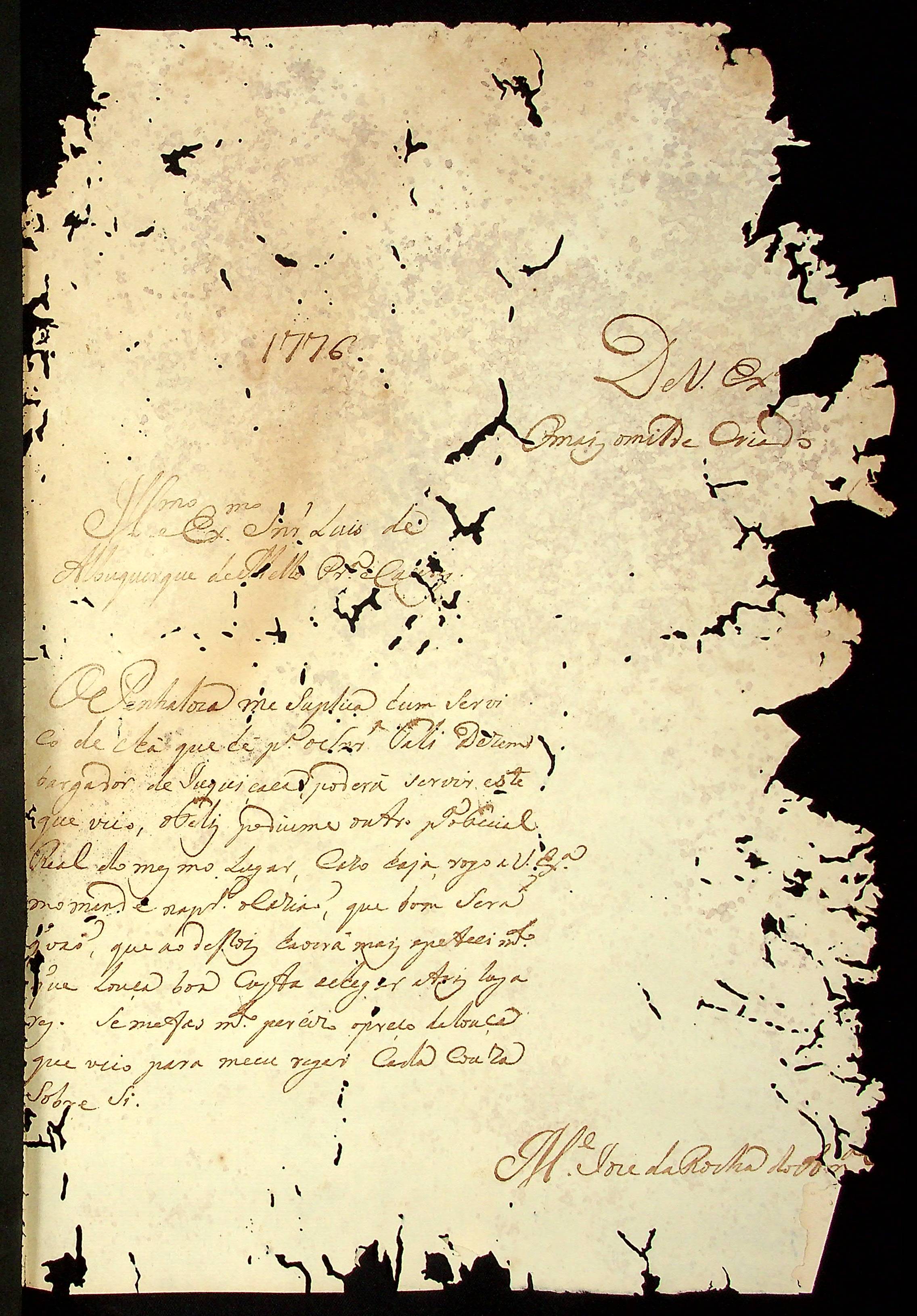 CARTA de Manoel José da Rocha Amaral ao Governador e Capitão-General da Capitania de Mato Grosso Luiz de Albuquerque de Mello Pereira e Cáceres.