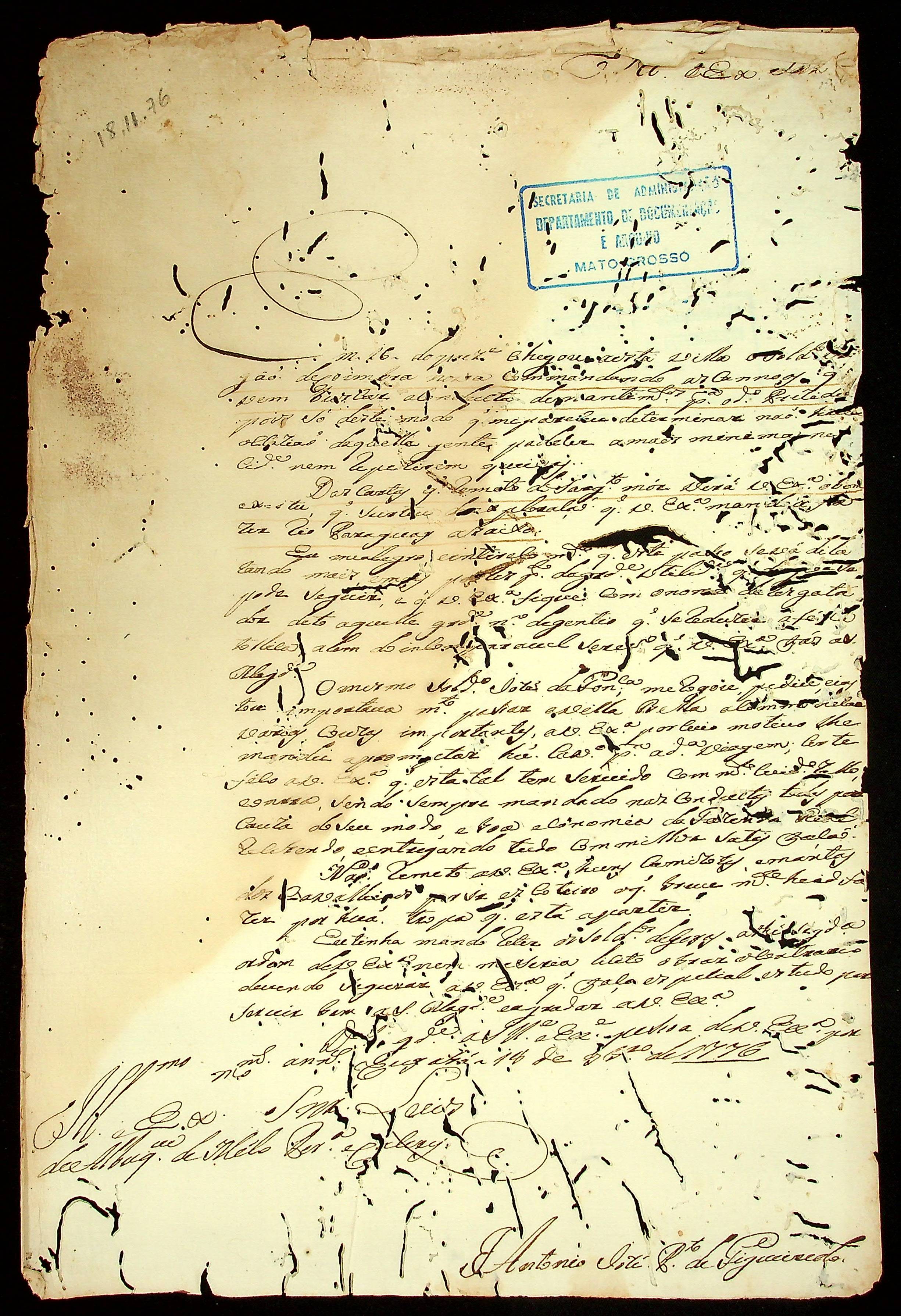 CARTA do [Mestre de Campo] Antônio José Pinto de Figueiredo ao [Governador e Capitão-General da Capitania de Mato Grosso] Luiz de Albuquerque de Mello Pereira e Cáceres.