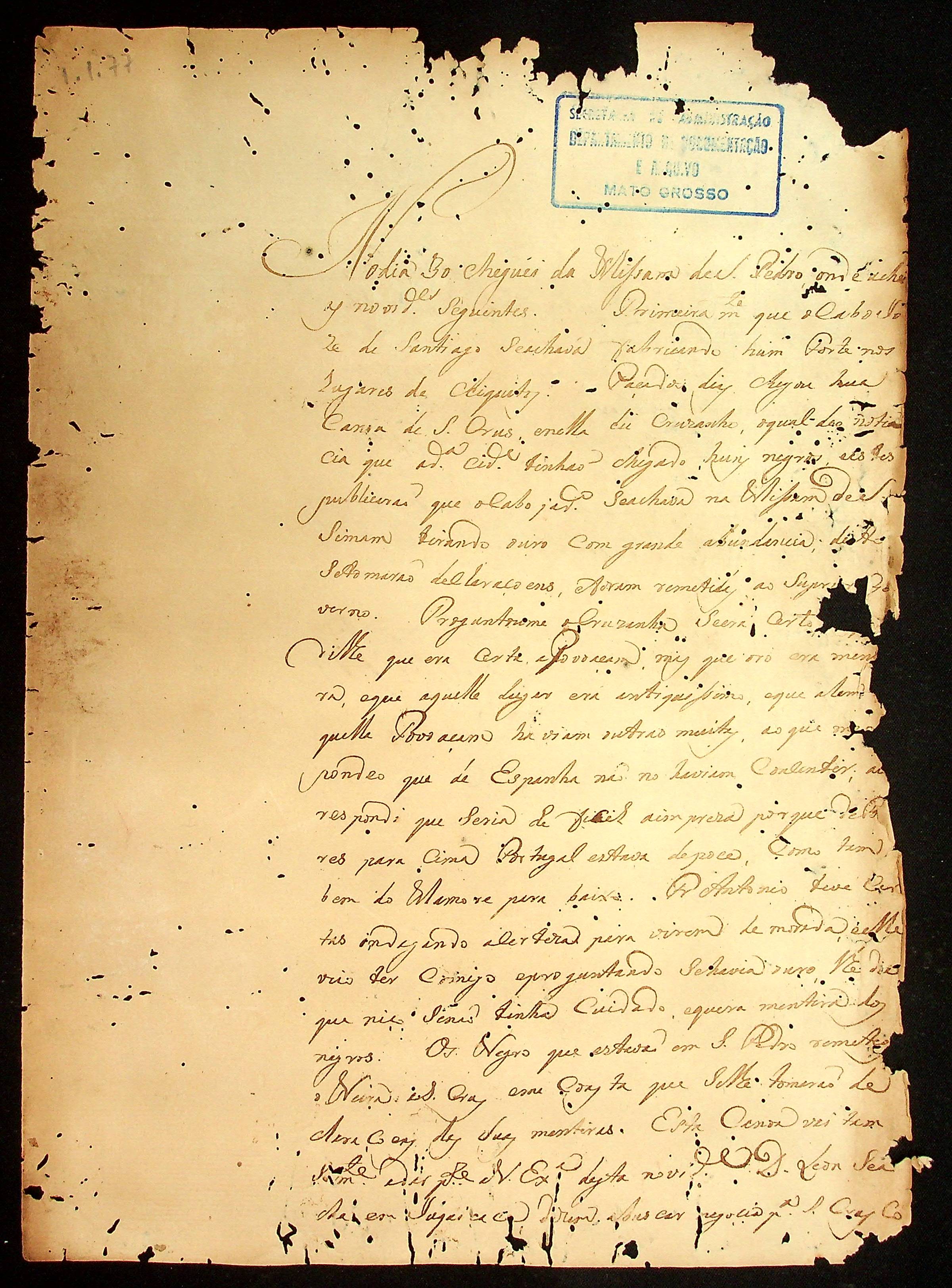 CARTA de Manoel José da Rocha do Amaral ao [Governador e Capitão-General da capitania de Mato Grosso] Luiz de Albuquerque de Mello Pereira e Cáceres.