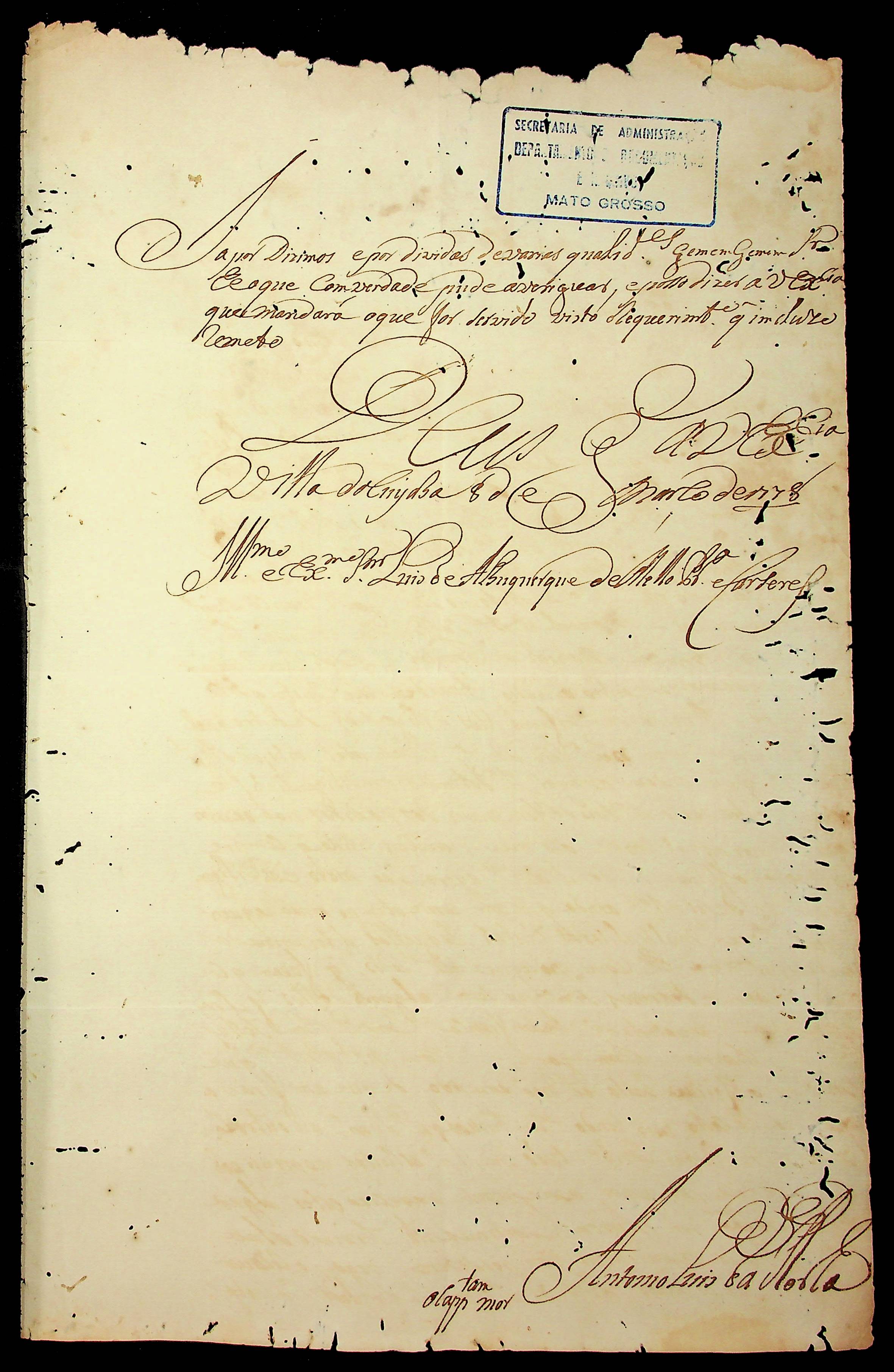 CARTA do [Capitão-mor] Antônio Luiz da Rocha ao [Governador e Capitão-General da Capitania de Mato Grosso] Luiz de Albuquerque de Mello Pereira e Cáceres.