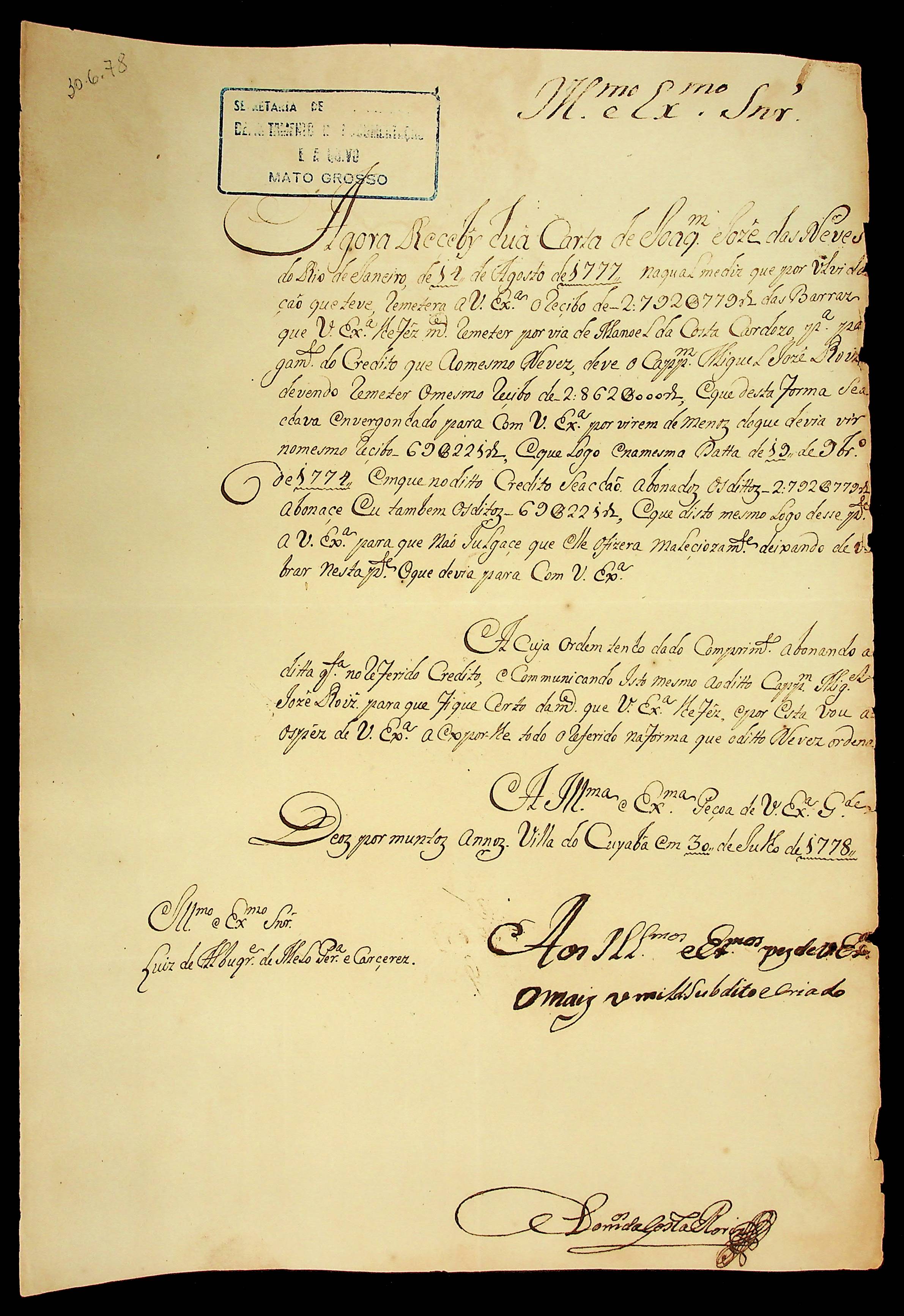 CARTA de Domingos da Costa Rodrigues ao Governador e Capitão-General da Capitania de Mato Grosso Luiz de Albuquerque de Mello Pereira e Cáceres.