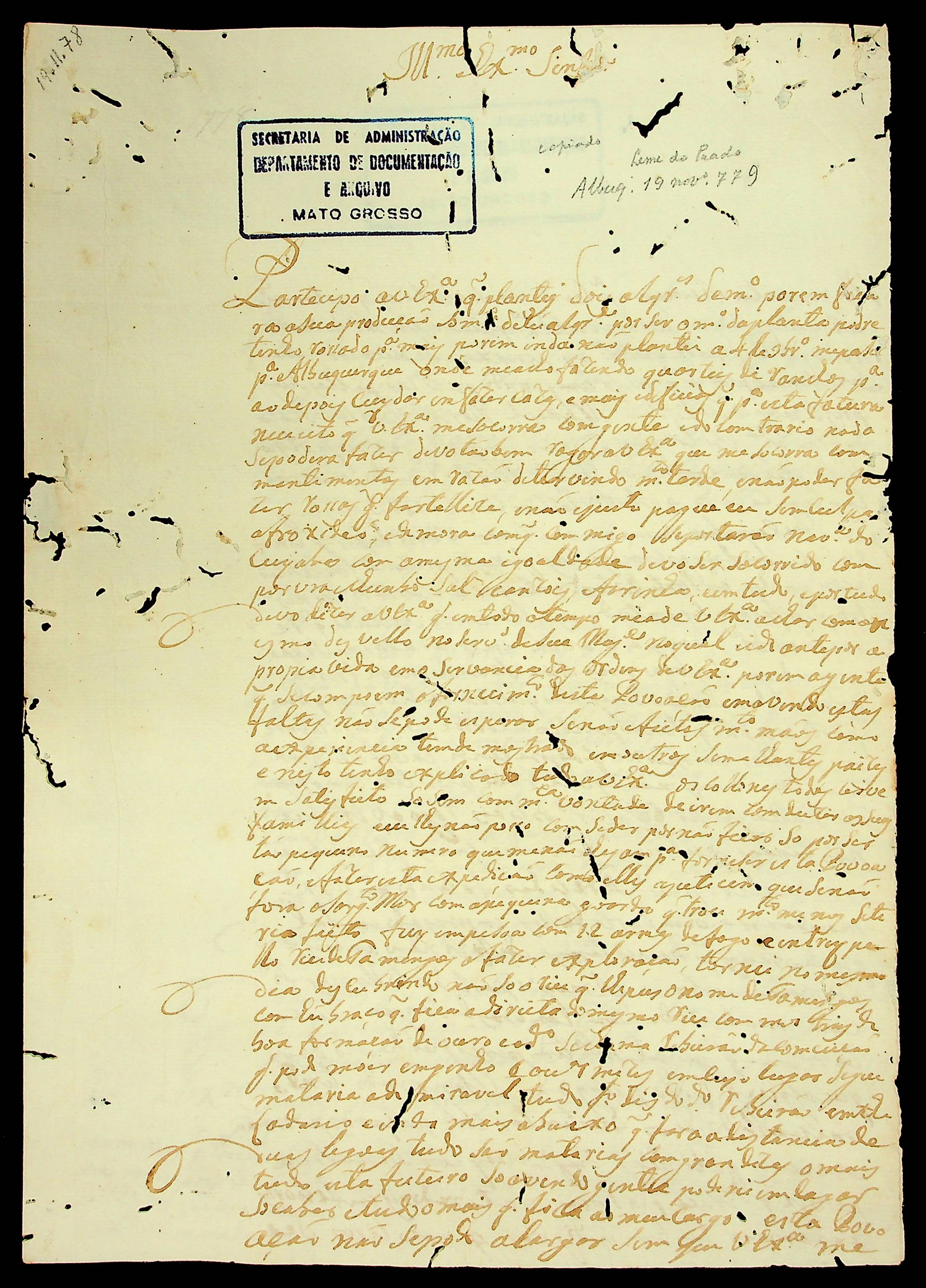 CARTA do [Capitão-mor] João Leme do Prado ao Governador e Capitão-General da Capitania de Mato Grosso Luiz de Albuquerque de Mello Pereira e Cáceres.