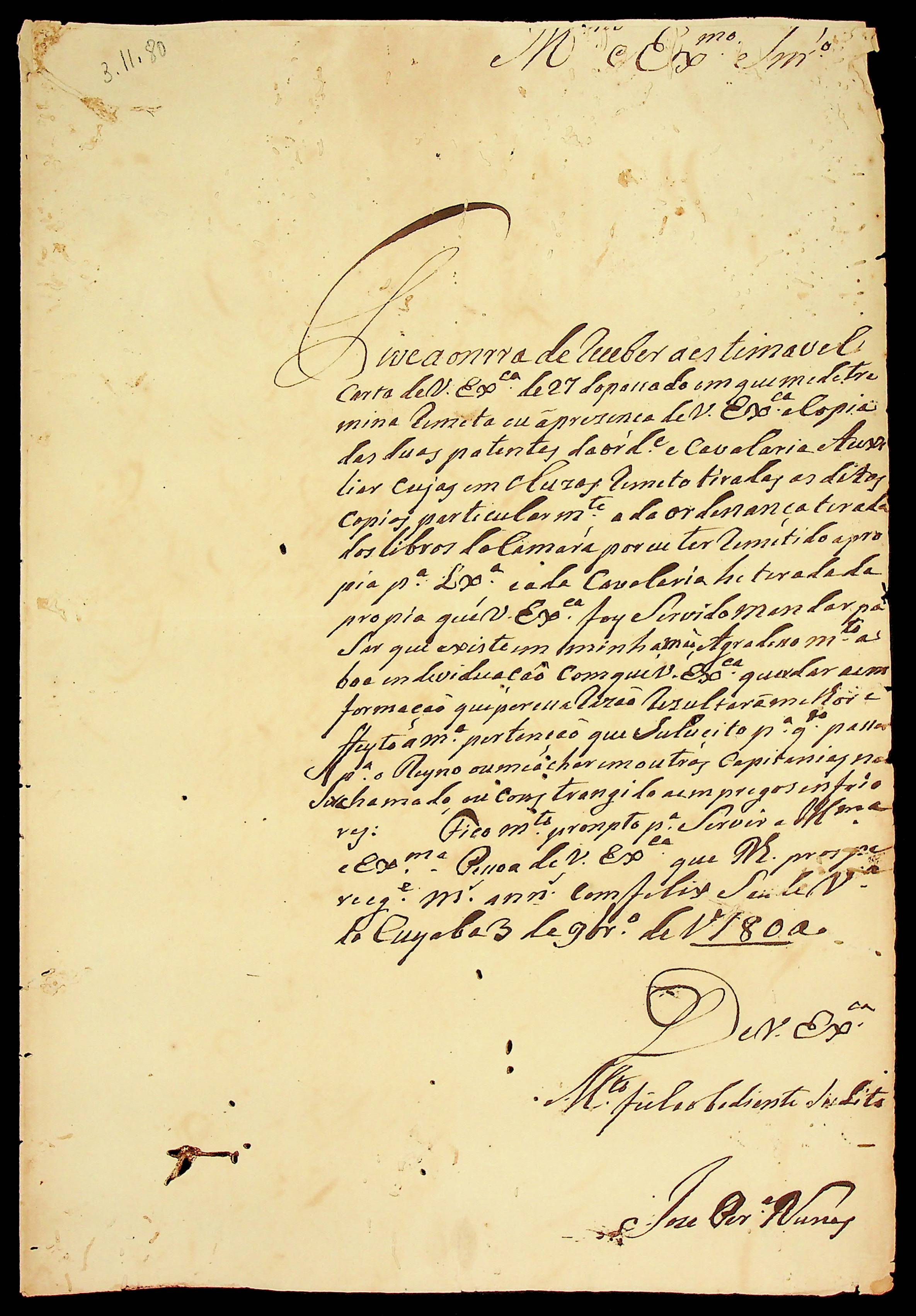 CARTA do [Capitão das Ordenanças] José Pereira Nunes ao [Governador e Capitão-General da Capitania de Mato Grosso Luiz de Albuquerque de Mello Pereira e Cáceres.