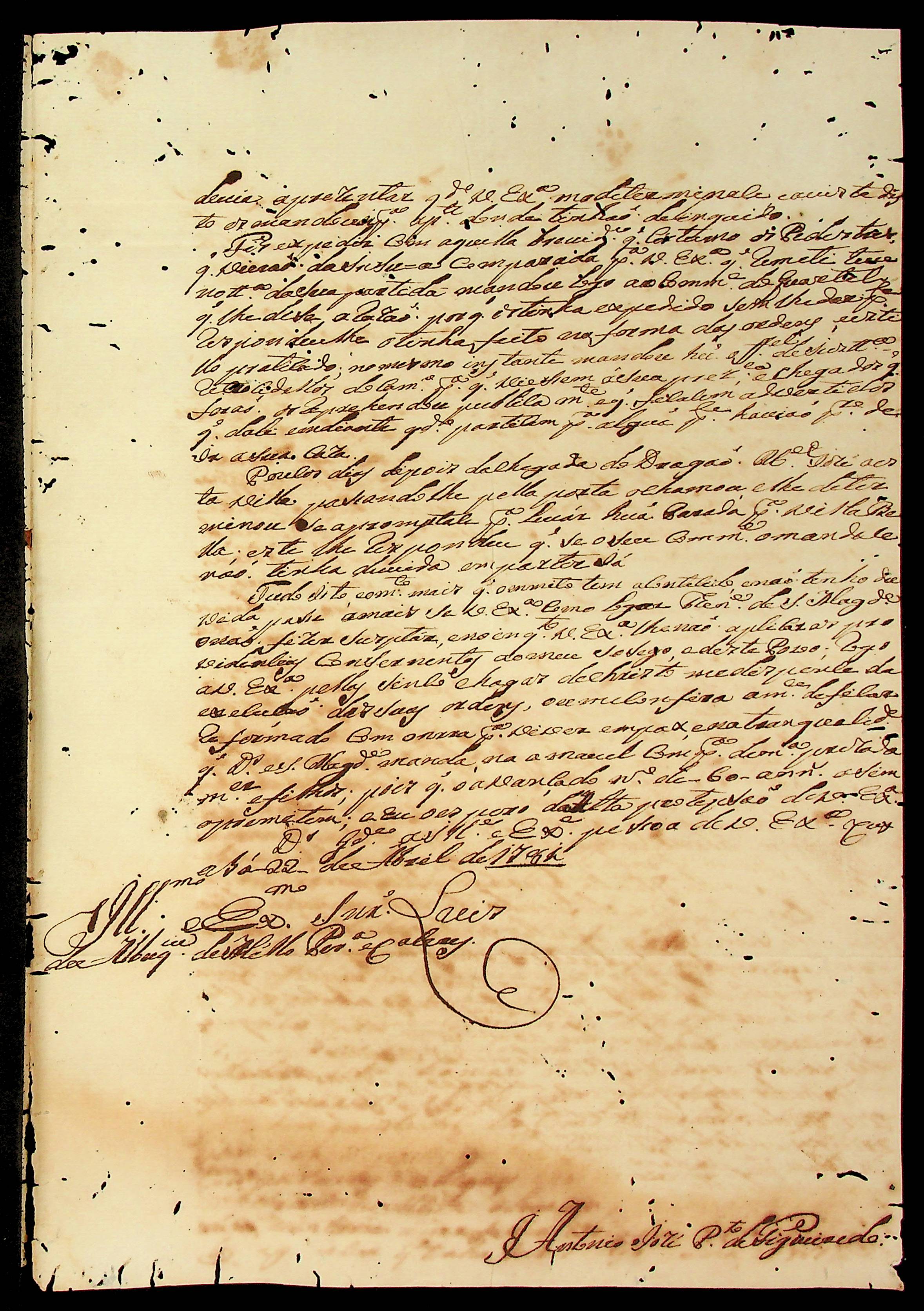 CARTA do [Mestre de Campo] Antônio José Pinto de Figueiredo ao [Governador e Capitão-General da Capitania de Mato Grosso] Luiz de Albuquerque de Mello Pereira e Cáceres.