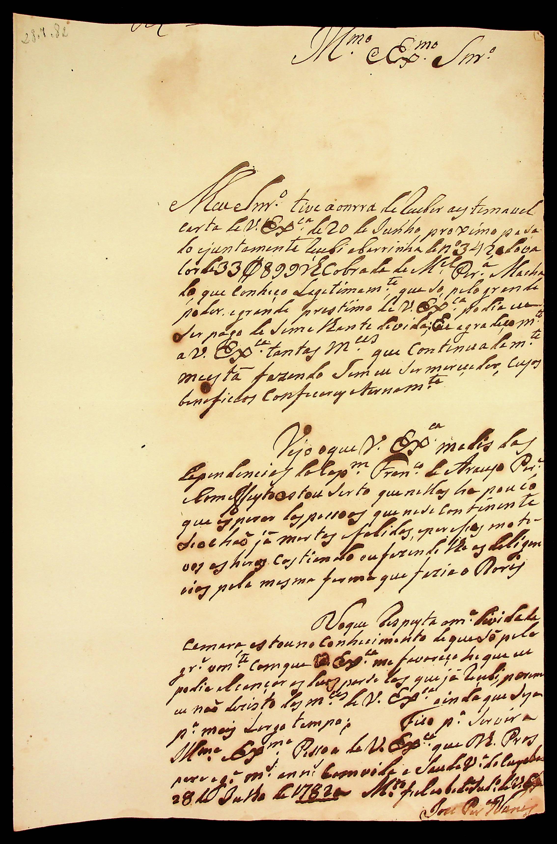 CARTA do [Capitão de Ordenanças da Vila do Cuiabá] José Pereira Nunes ao [Governador e Capitão-General da Capitania de Mato Grosso] Luiz de Albuquerque de Mello Pereira e Cáceres.