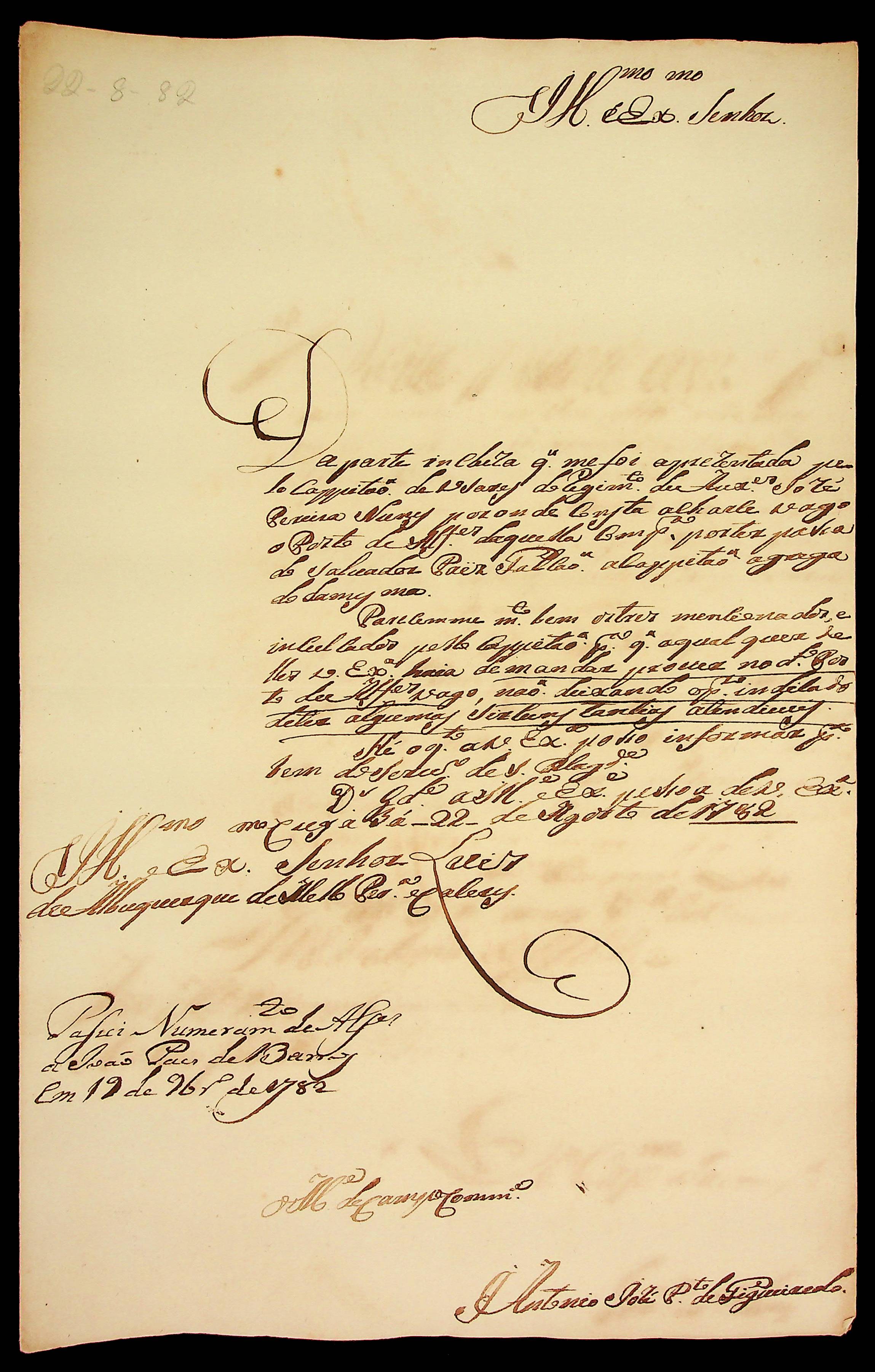 CARTA do [Mestre de Campo] Antônio José Pinto de Figueiredo ao [Governador e Capitão-General da Capitania de Mato Grosso] Luiz de Albuquerque de Mello Pereira e Cáceres.