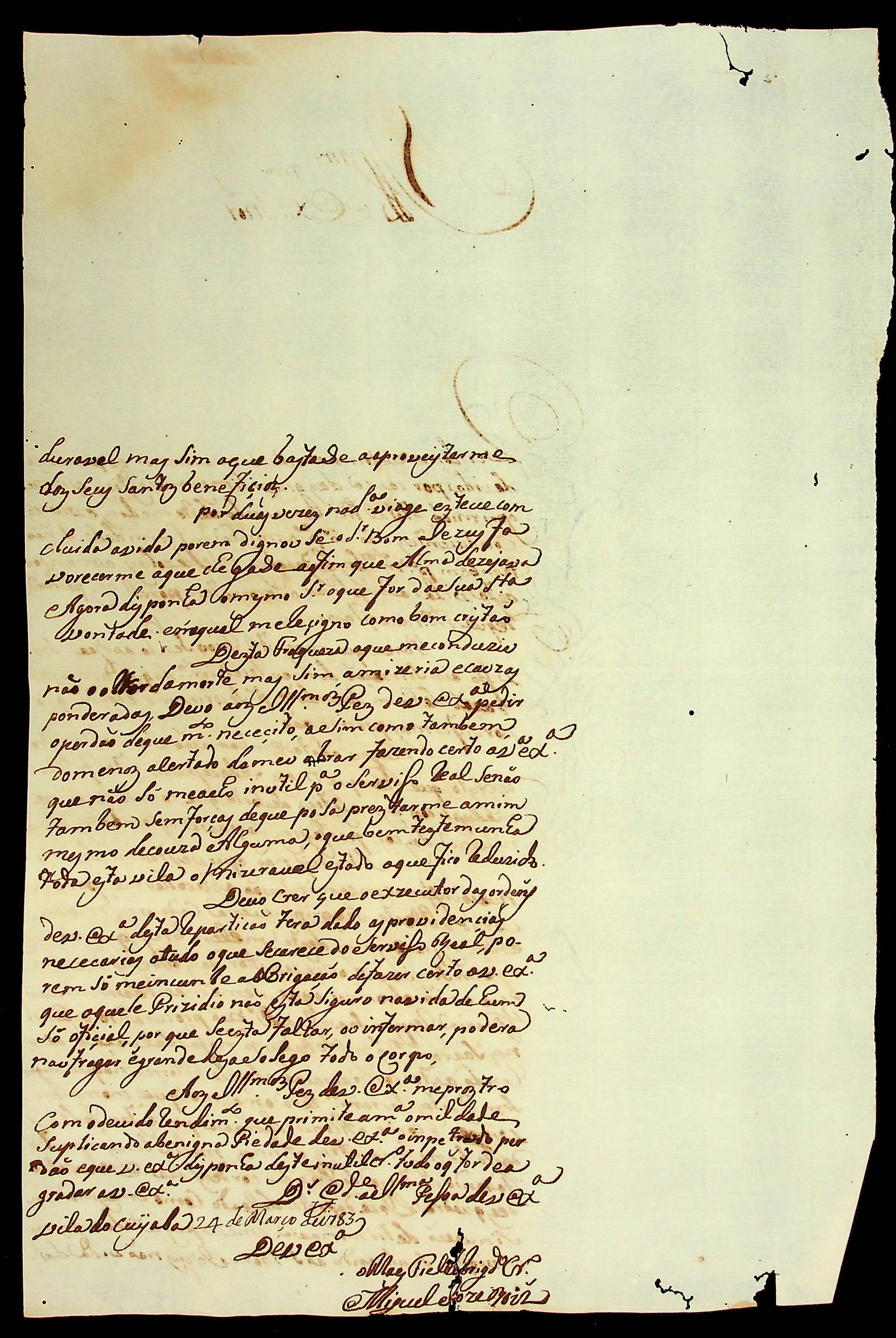 CARTA de Miguel José Rodrigues ao [Governador e Capitão-General de Mato Grosso] Luiz de Albuquerque de Mello Pereira e Cáceres.