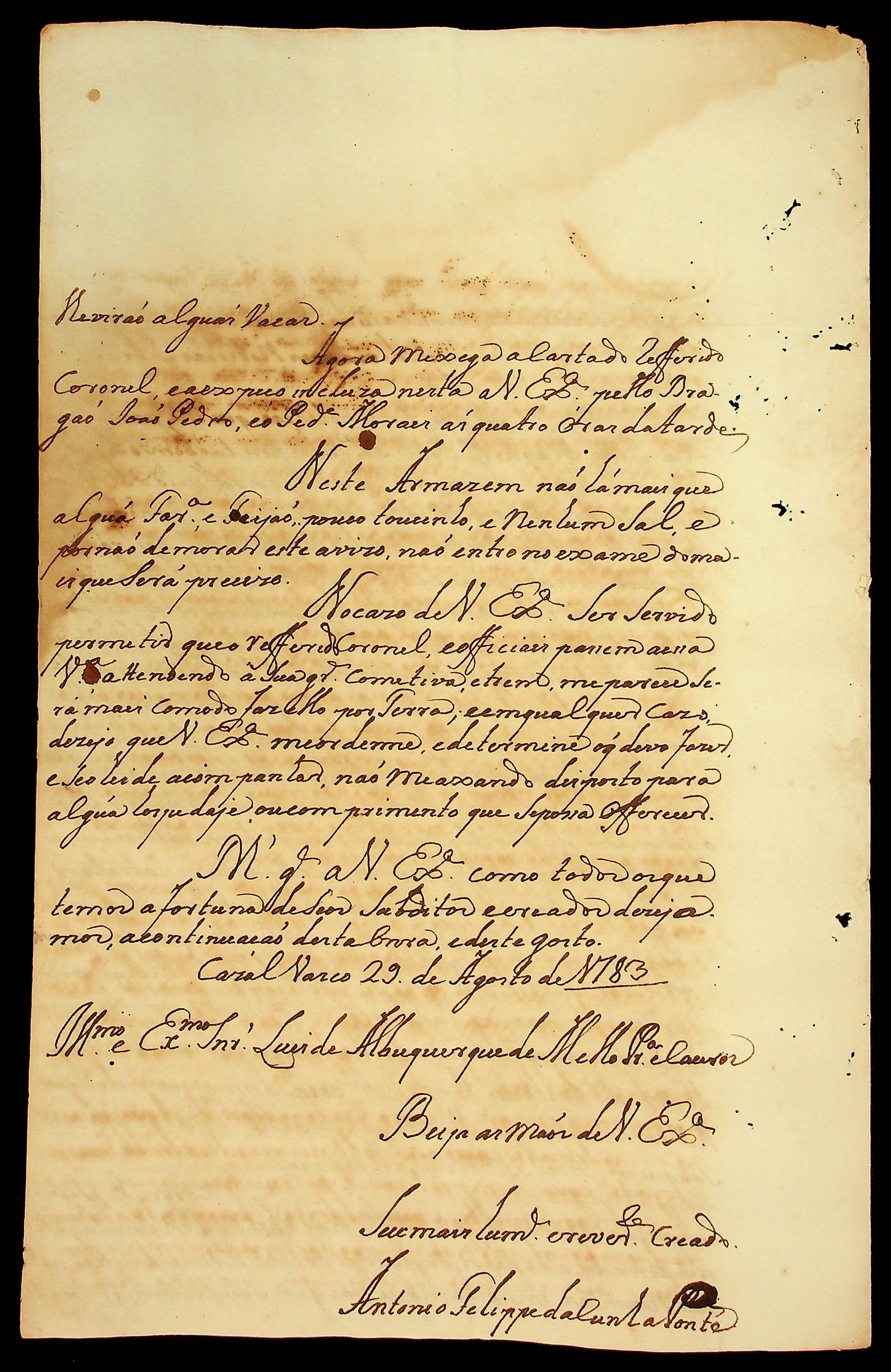 CARTA de Antônio Felipe da Cunha Ponte ao [Governador e Capitão-General da Capitania de Mato Grosso] Luiz de Albuquerque de Mello Pereira e Cáceres.