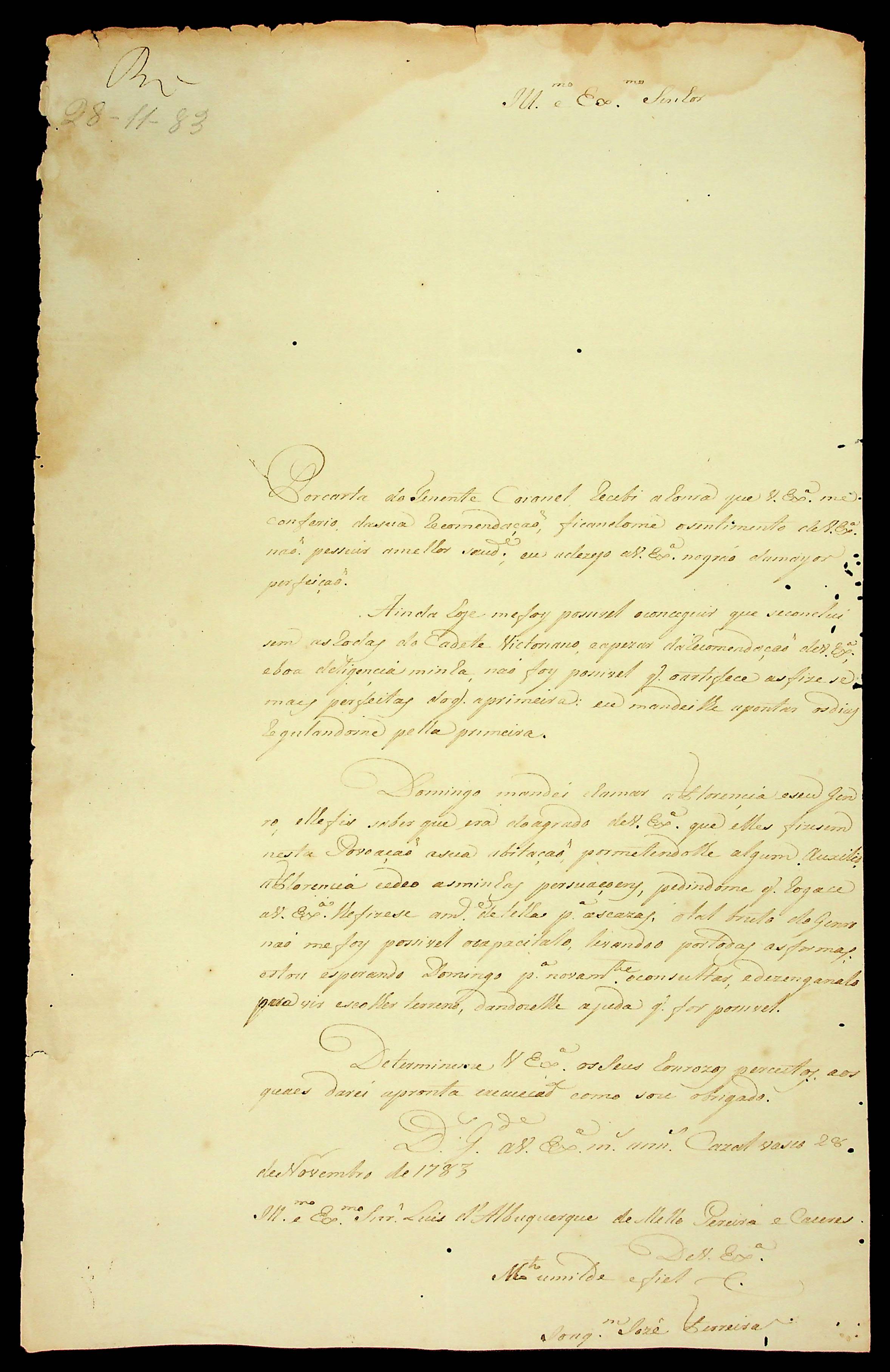 CARTA do [Capitão Engenheiro das Demarcações] Joaquim José Ferreira ao [Governador e Capitão-General da Capitania de Mato Grosso] Luiz de Albuquerque de Mello Pereira e Cáceres.