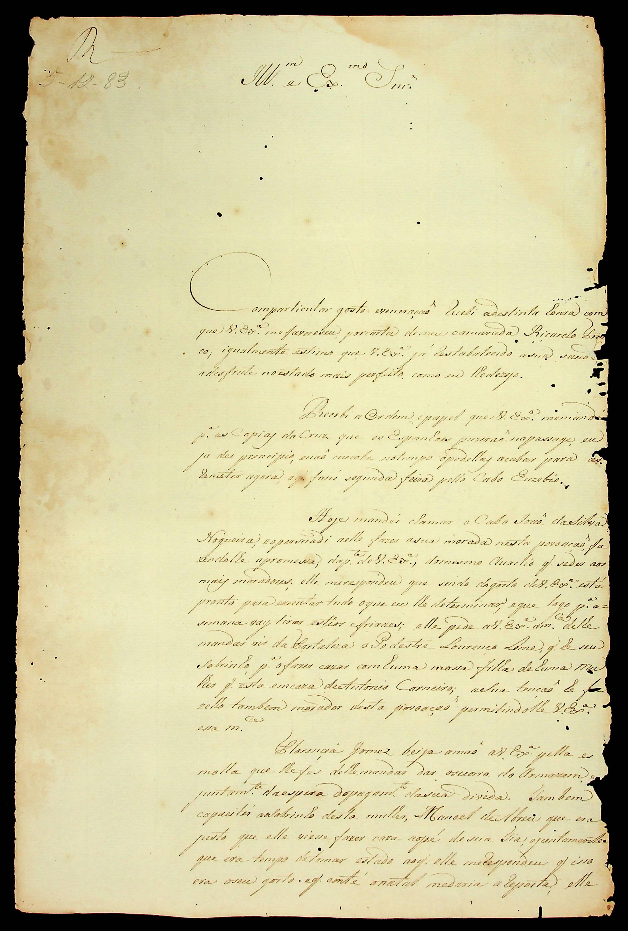 CARTA do [Capitão Engenheiro das Demarcações] Joaquim José Ferreira ao [Governador e Capitão-General de Mato Grosso] Luiz de Albuquerque de Mello Pereira e Cáceres.