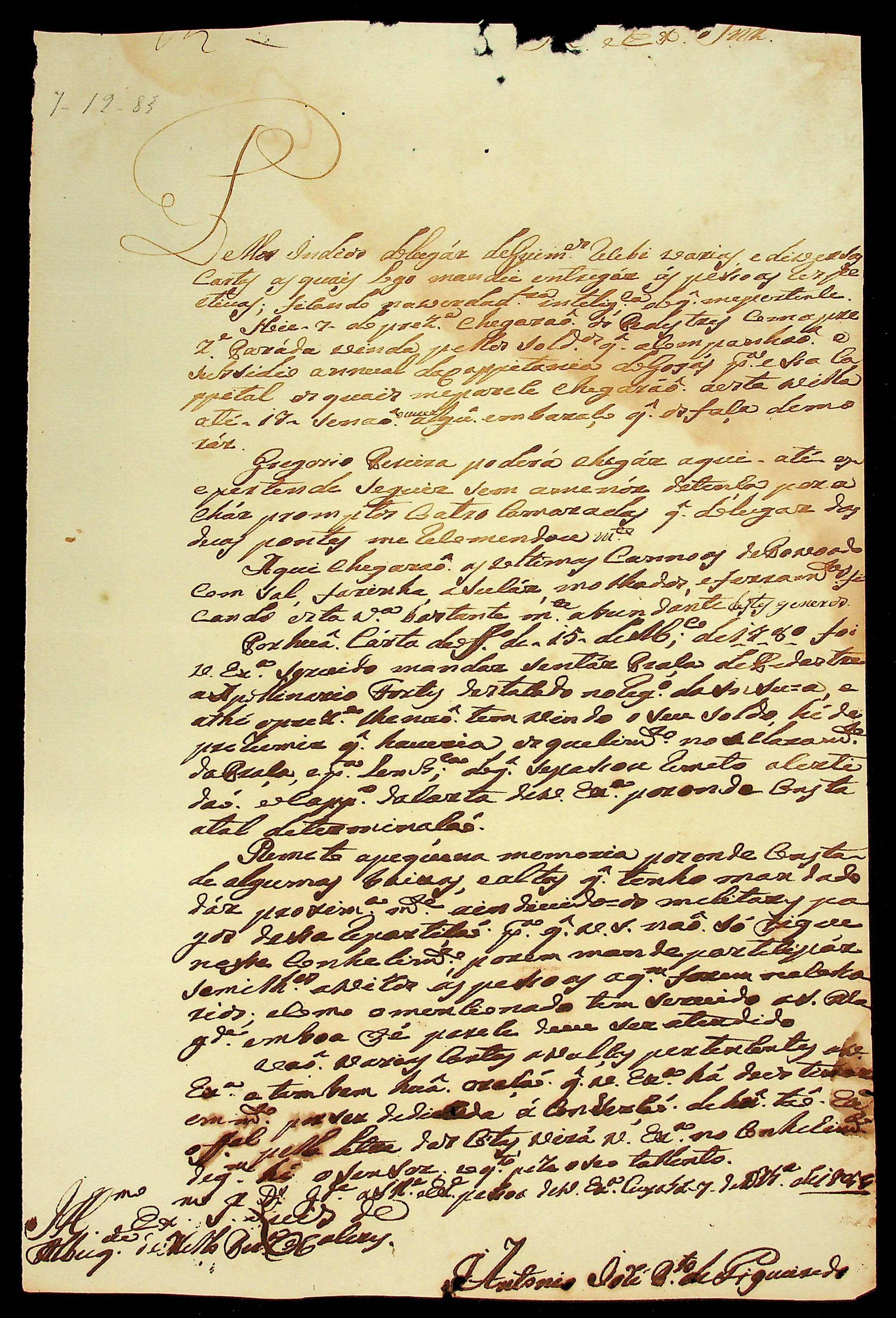 CARTA do [Mestre de Campo] Antônio José Pinto de Figueiredo ao [Governador e Capitão-General da Capitania de Mato Grosso] Luiz de Albuquerque de Mello Pereira e Cáceres.