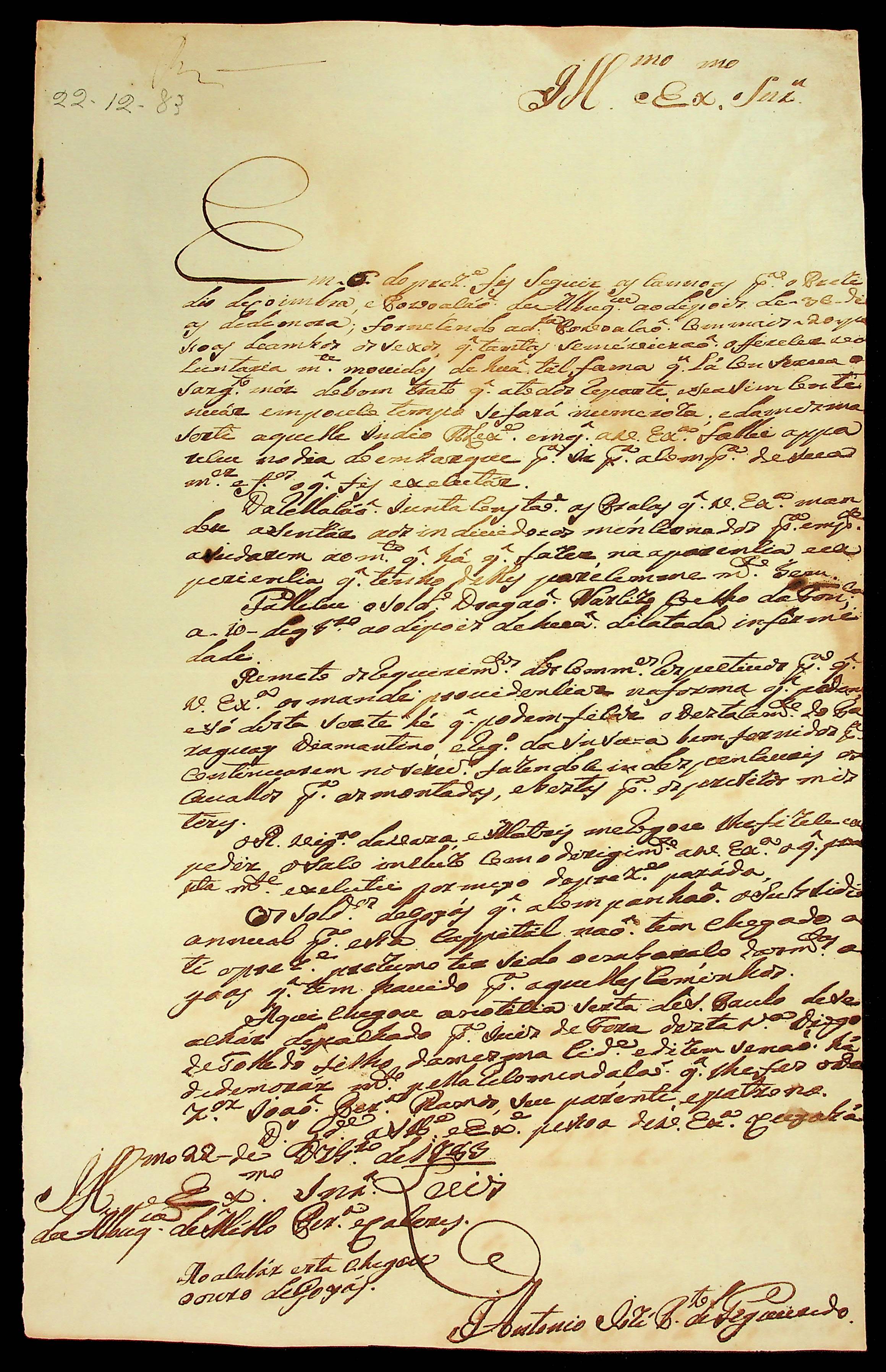 CARTA do [Mestre de Campo] Antônio José Pinto de Figueiredo ao [Governador e Capitão-General da Capitania de Mato Grosso] Luiz de Albuquerque de Mello Pereira e Cáceres.