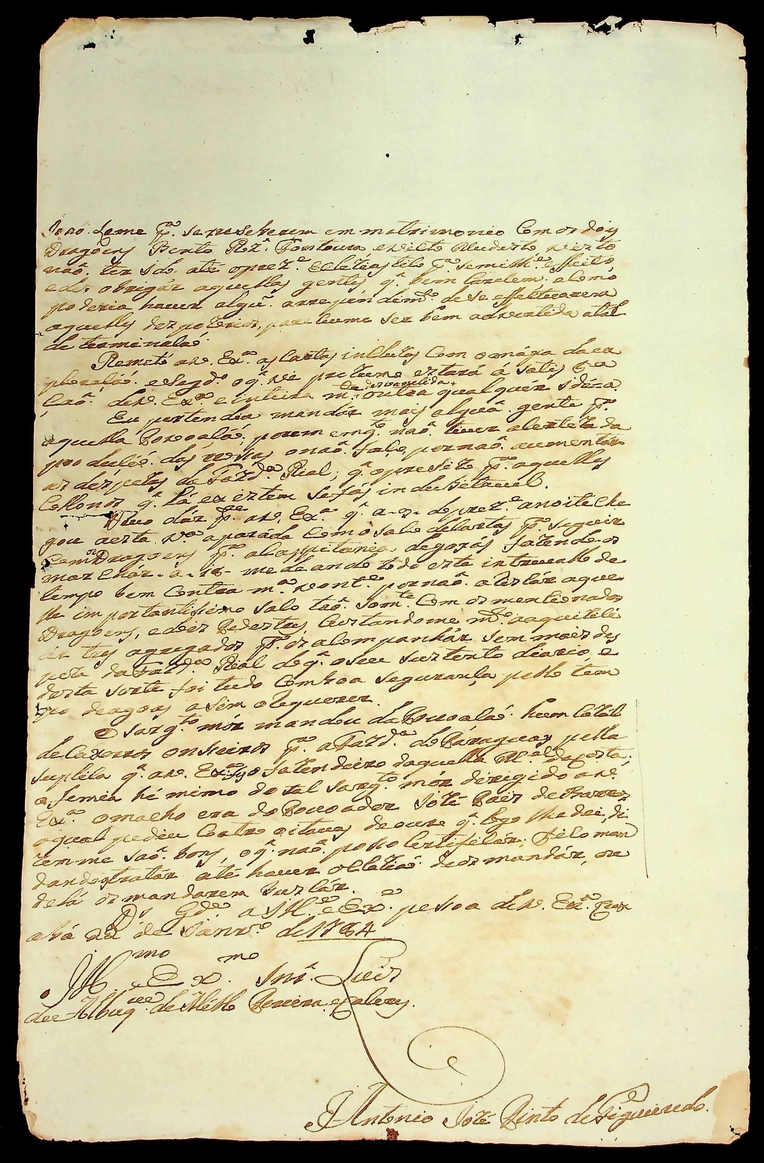 CARTA do [Mestre de Campo] Antônio José Pinto de Figueiredo ao [Governador e Capitão-General da Capitania de Mato Grosso] Luiz de Albuquerque de Mello Pereira e Cáceres.