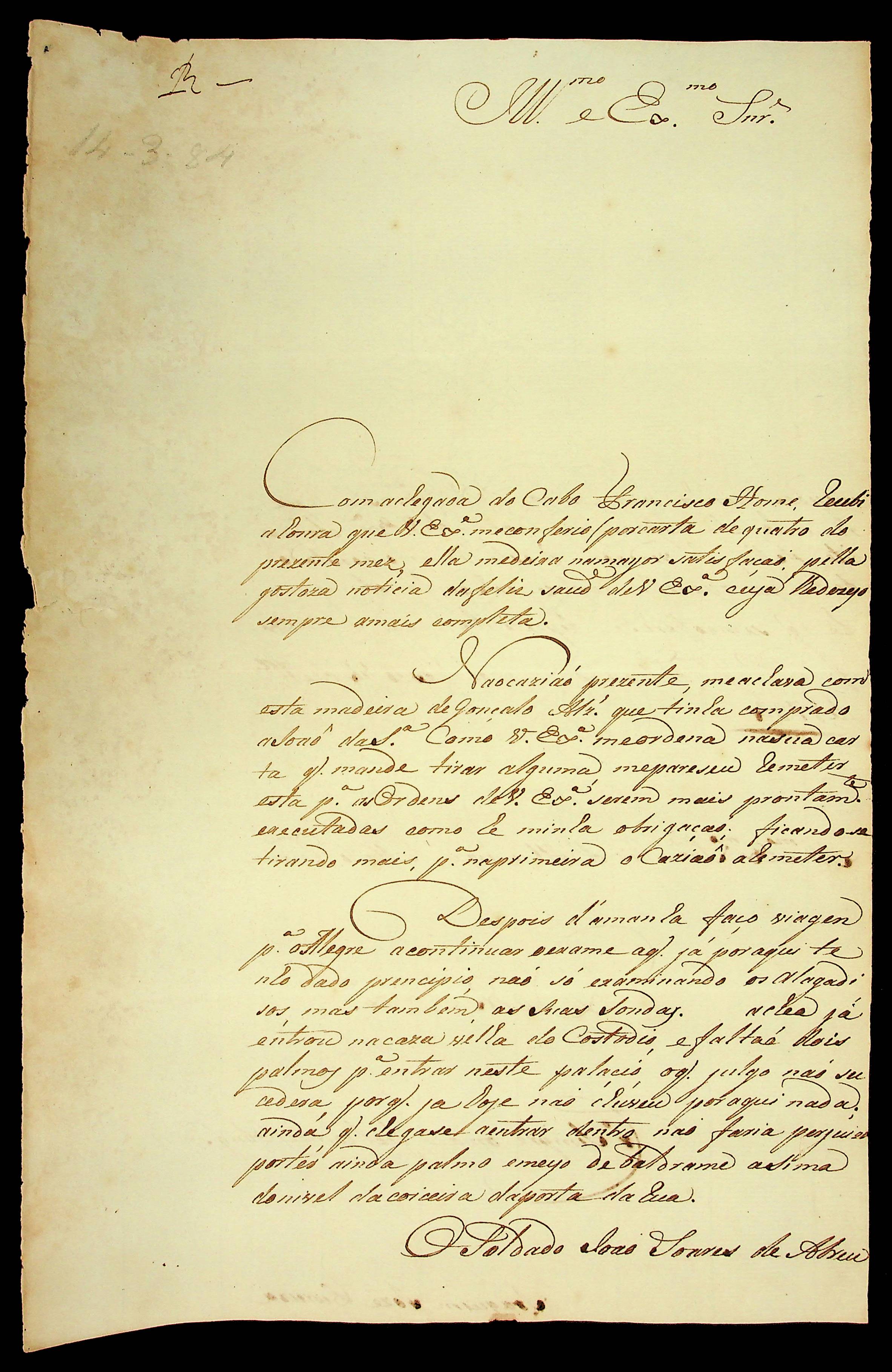 CARTA do [Capitão] Joaquim José Ferreira ao [Governador e Capitão-General da Capitania de Mato Grosso] Luiz de Albuquerque de Mello Pereira e Cáceres.