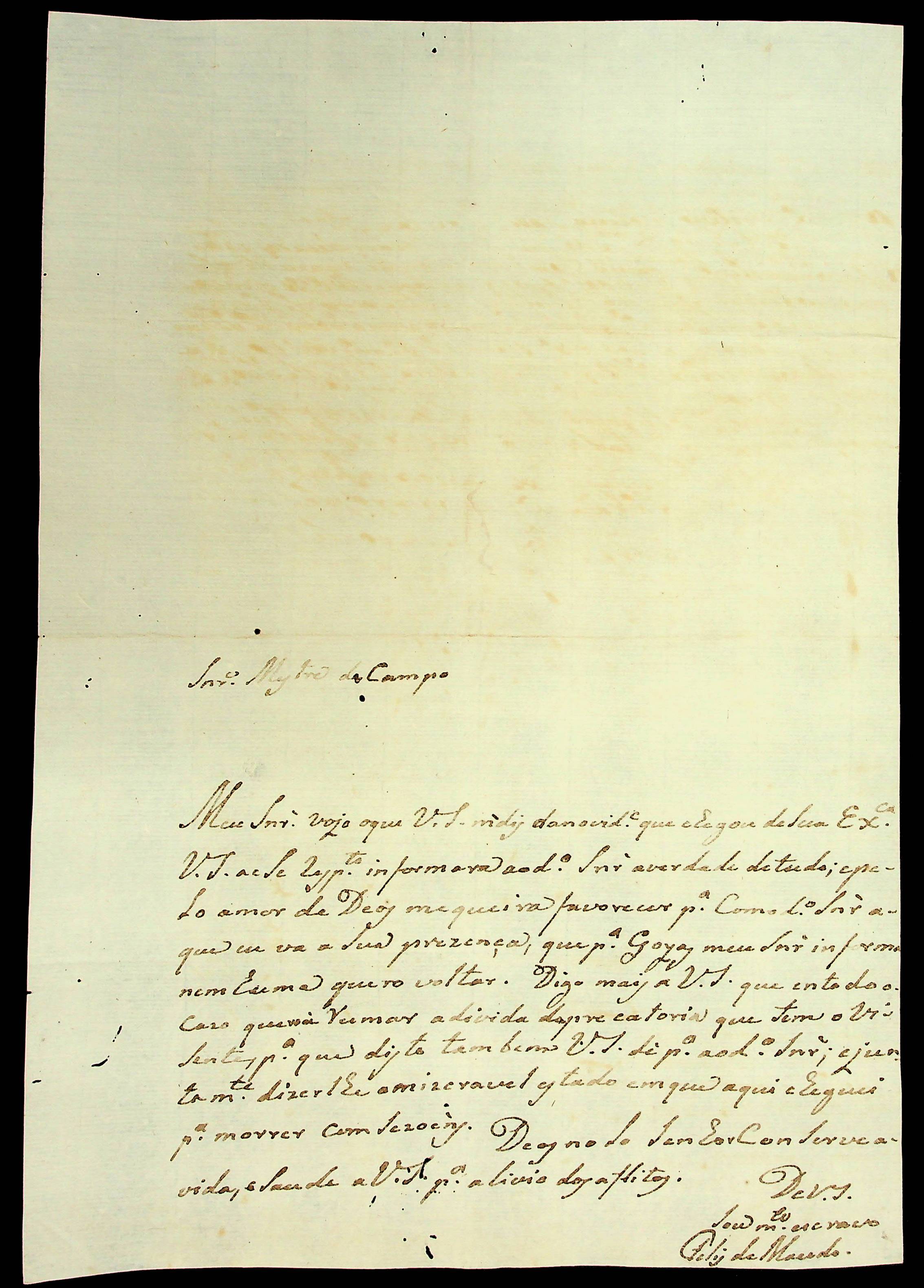 CARTA do [Mestre de Campo] Antônio José Pinto de Figueiredo ao [Governador e Capitão-General da Capitania de Mato Grosso] Luiz de Albuquerque de Mello Pereira e Cáceres