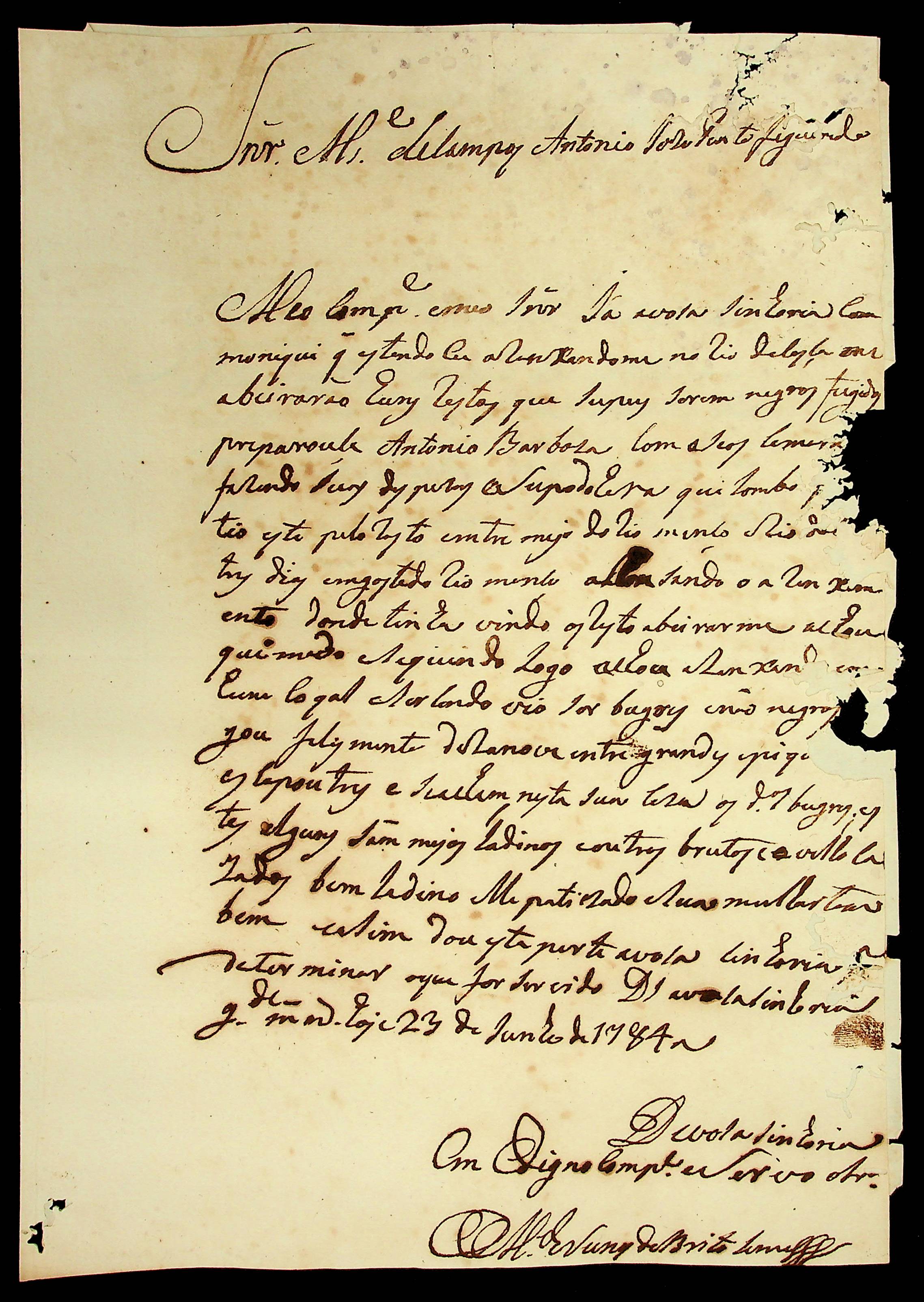 CARTA de Manoel Nunes de Brito Leme ao [Mestre de Campo] Antônio José Pinto de Figueiredo.
