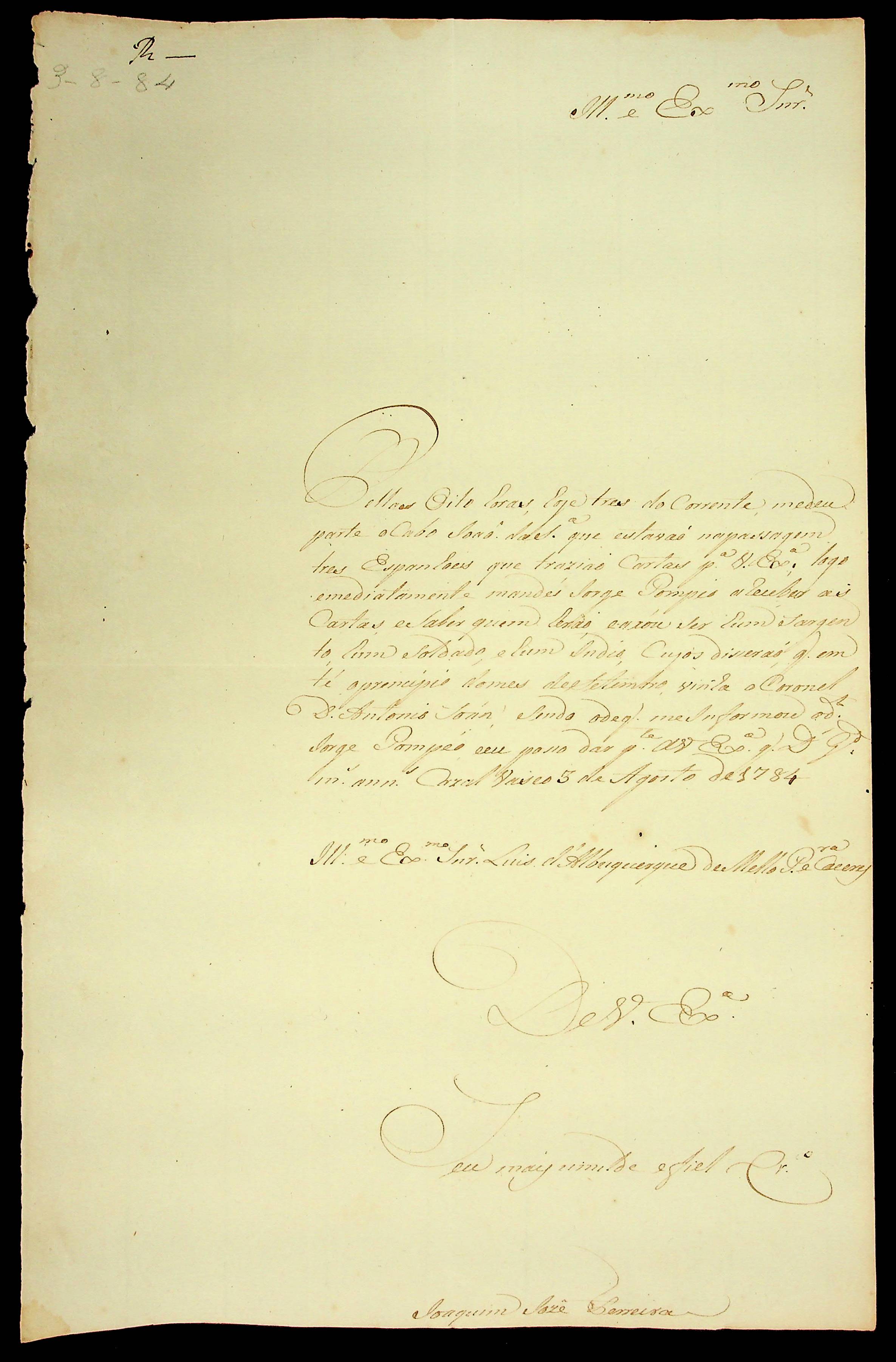 CARTA do [Capitão] Joaquim José Ferreira ao [Governador e Capitão-General da Capitania de Mato Grosso] Luiz de Albuquerque de Mello Pereira e Cáceres.
