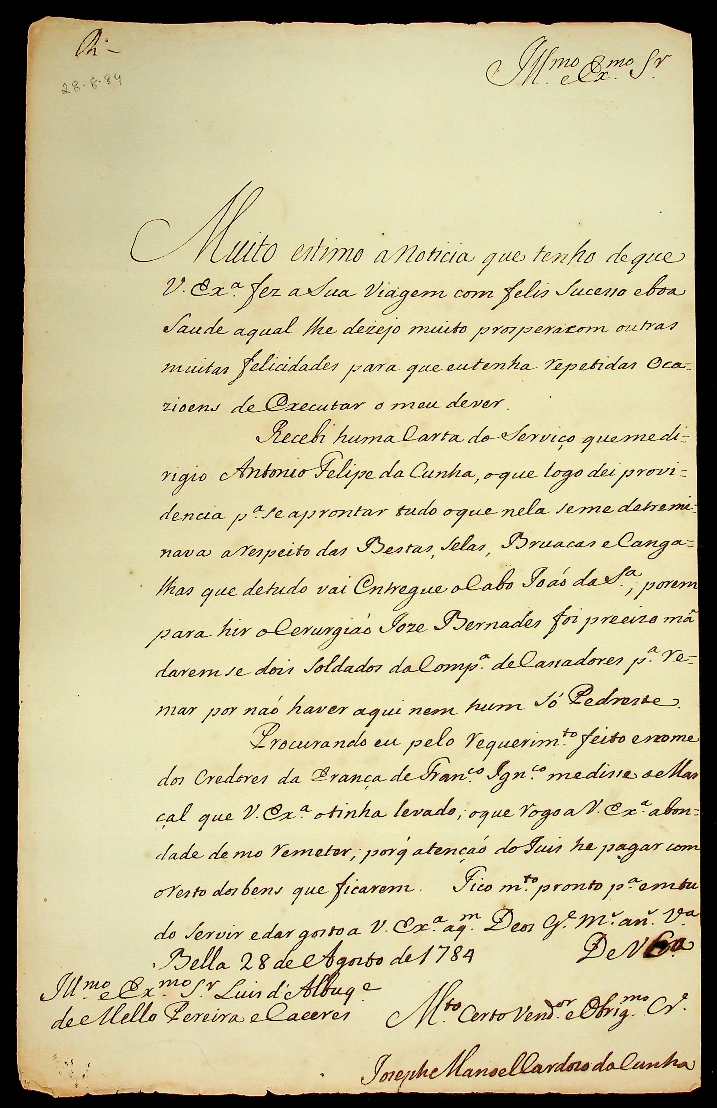 CARTA do [Sargento-mor] Joseph Manoel Cardoso da Cunha ao Governador e Capitão-General Luiz de Albuquerque de Mello Pereira e Cáceres.