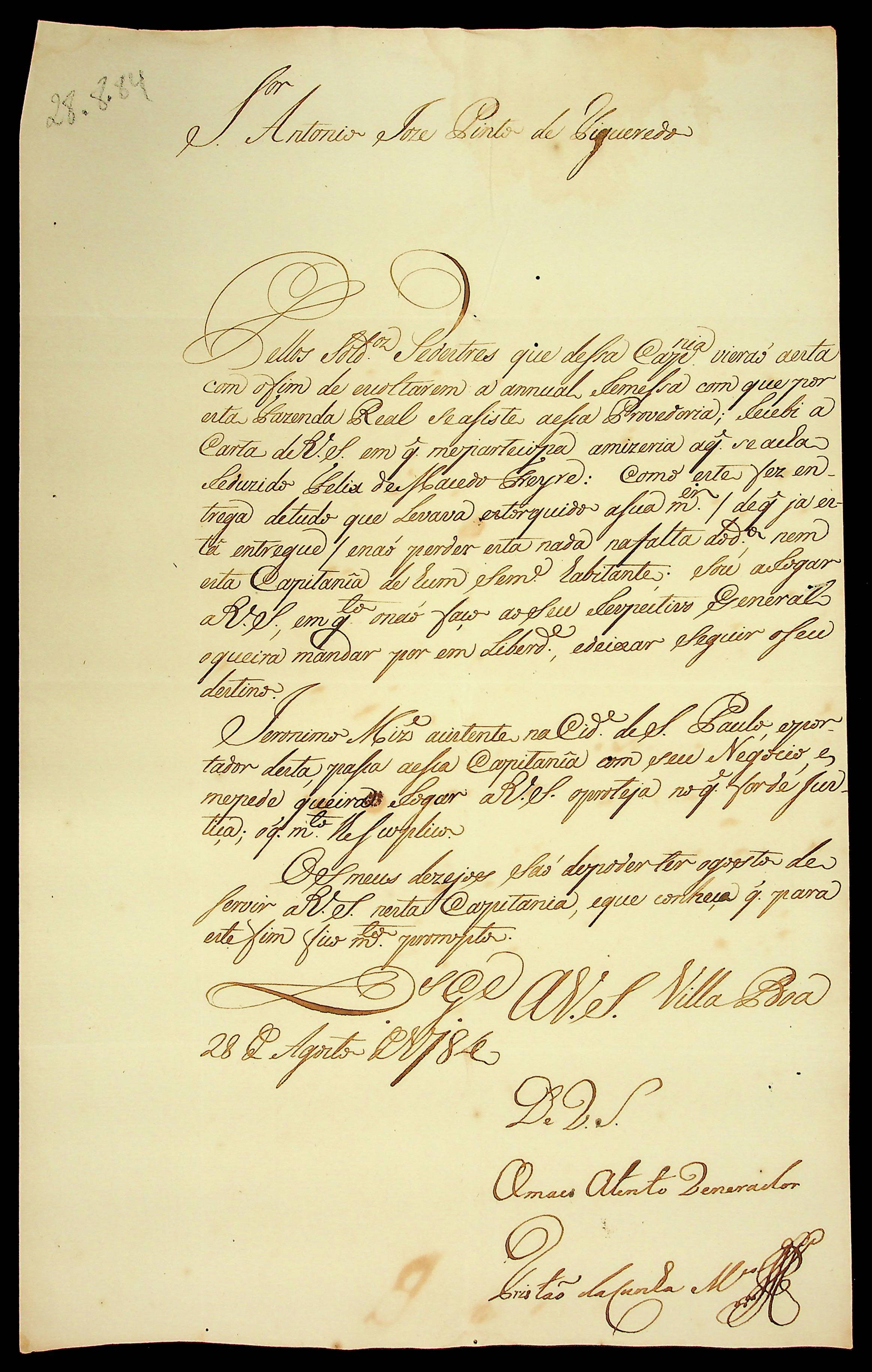 CARTA do [Governador e Capitão-General da Capitania de Goiás] Tristão da Cunha Menezes ao Mestre de Campo Antônio José Pinto de Figueiredo.