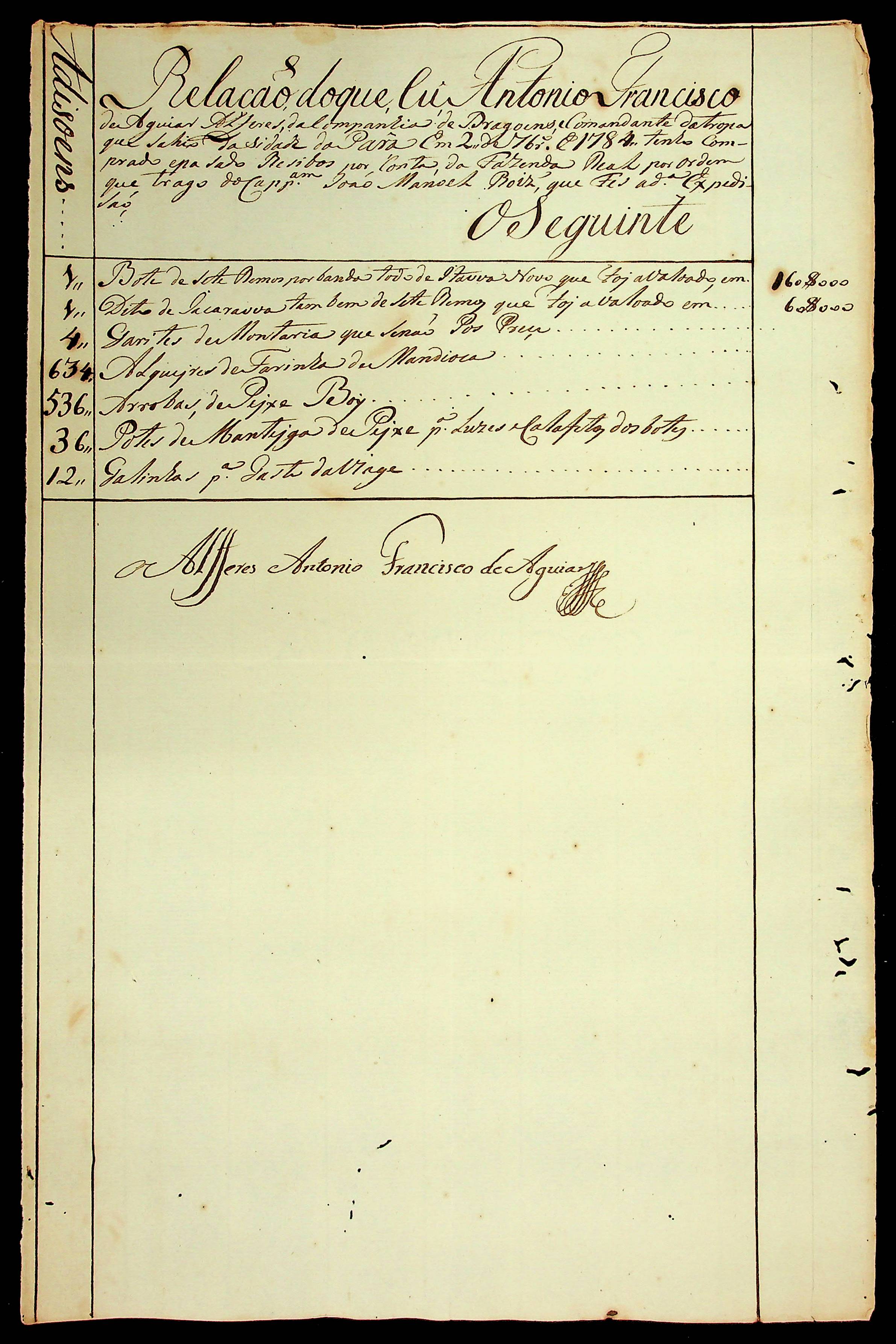 CARTA do Alferes da Companhia de Dragões Antônio Francisco de Aguiar ao Governador e Capitão-General da Capitania de Mato Grosso Luiz de Albuquerque de Mello Pereira e Cáceres.